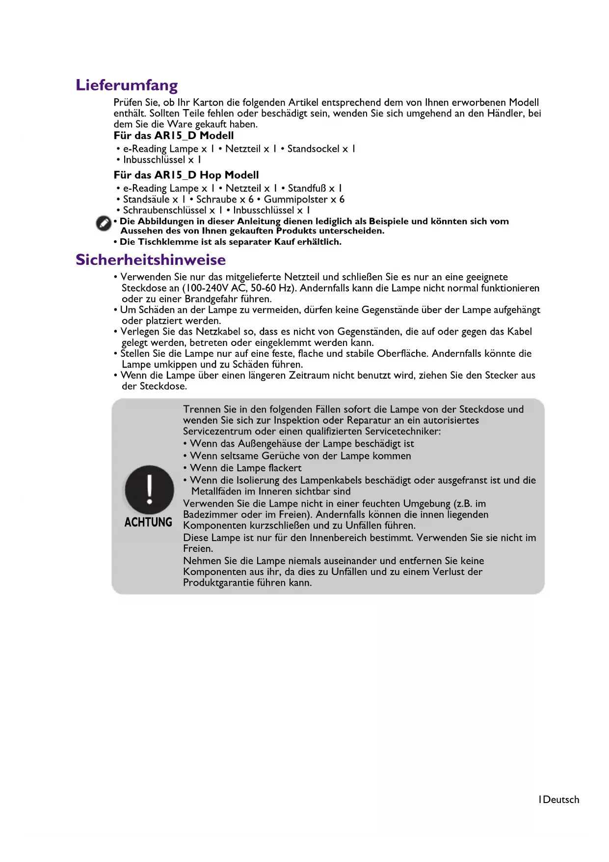 - Wenn die Isolierung des Lampenkabels beschädigt oder ausgefranst ist und die Metallfäden im Inneren sichtbar sind Verwenden Sie die Lampe nicht in einer feuchten Umgebung (z.B. im Badezimmer oder im Freien). Andernfalls können die innen liegenden Komponenten kurzschließen und zu Unfällen führen. Diese Lampe ist nur für den Innenbereich bestimmt. Verwenden Sie sie nicht im Freien. Nehmen Sie die Lampe niemals auseinander und entfernen Sie keine Komponenten aus ihr, da dies zu Unfällen und zu einem Verlust der Produktgarantie führen kann. ACHTUNG2Deutsch Installation Für das AR15_D Modell mit einem Standsockel