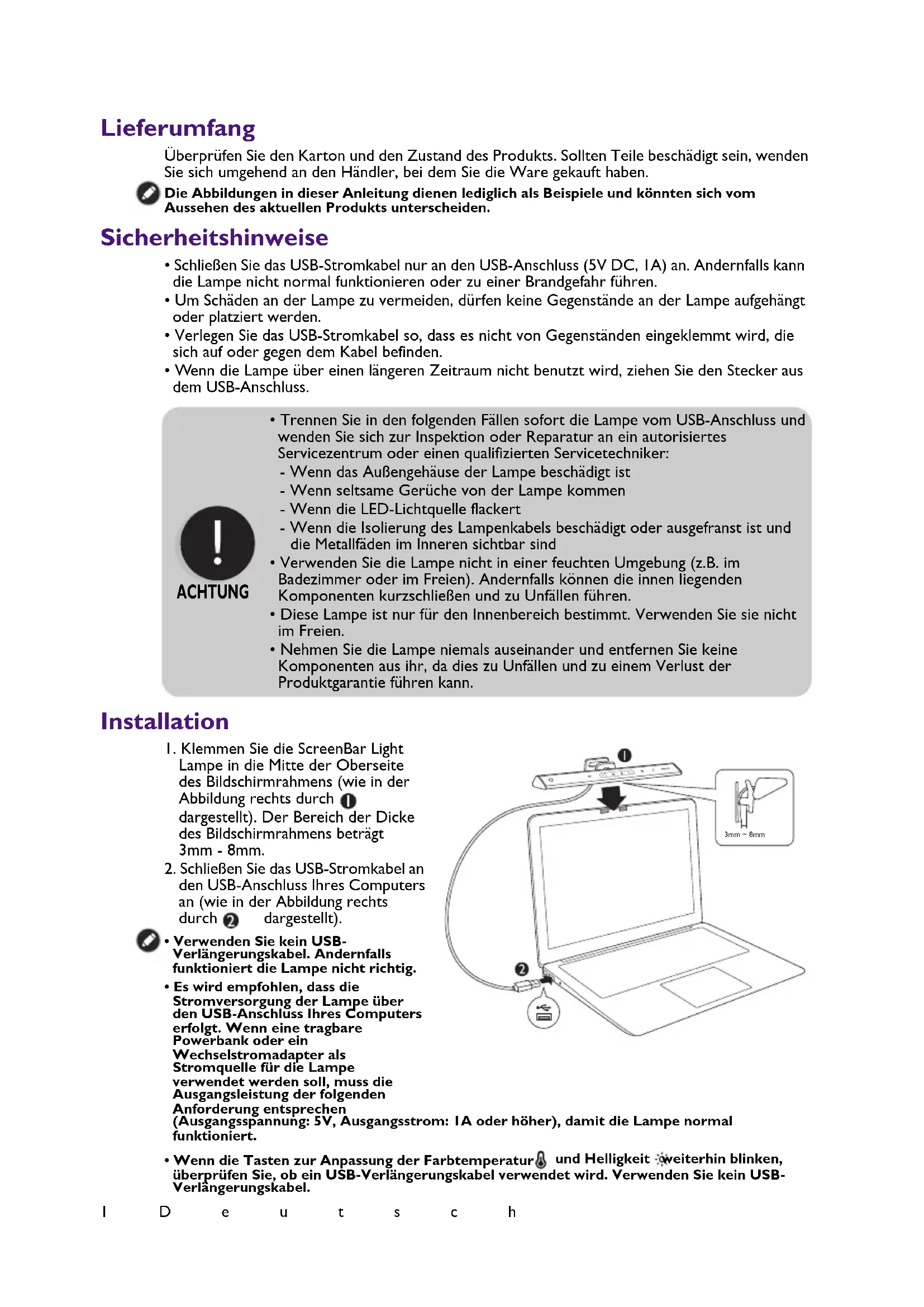- If the problem persists, please contact the original place of purchase for help. Specifications According to your screen size and preference, you can adjust the angle of the lamp within the range of 85 degrees. To achieve the optimum lighting effect, it is recommended that you adjust the angle of the lamp so that the bottom side of the lamp and the desk surface are parallel to each other. 85° Parallel Model AR18_C DC power input 5V, 1A Max. power consumption 5W Dimensions 260 x 43 x 46 mm (Width x Depth x Height)1Deutsch Lieferumfang Überprüfen Sie den Karton und den Zustand des Produkts. Sollten Teile beschädigt sein, wenden Sie sich umgehend an den Händler, bei dem Sie die Ware gekauft haben. Die Abbildungen in dieser Anleitung dienen lediglich als Beispiele und könnten sich vom Aussehen des aktuellen Produkts unterscheiden. Sicherheitshinweise