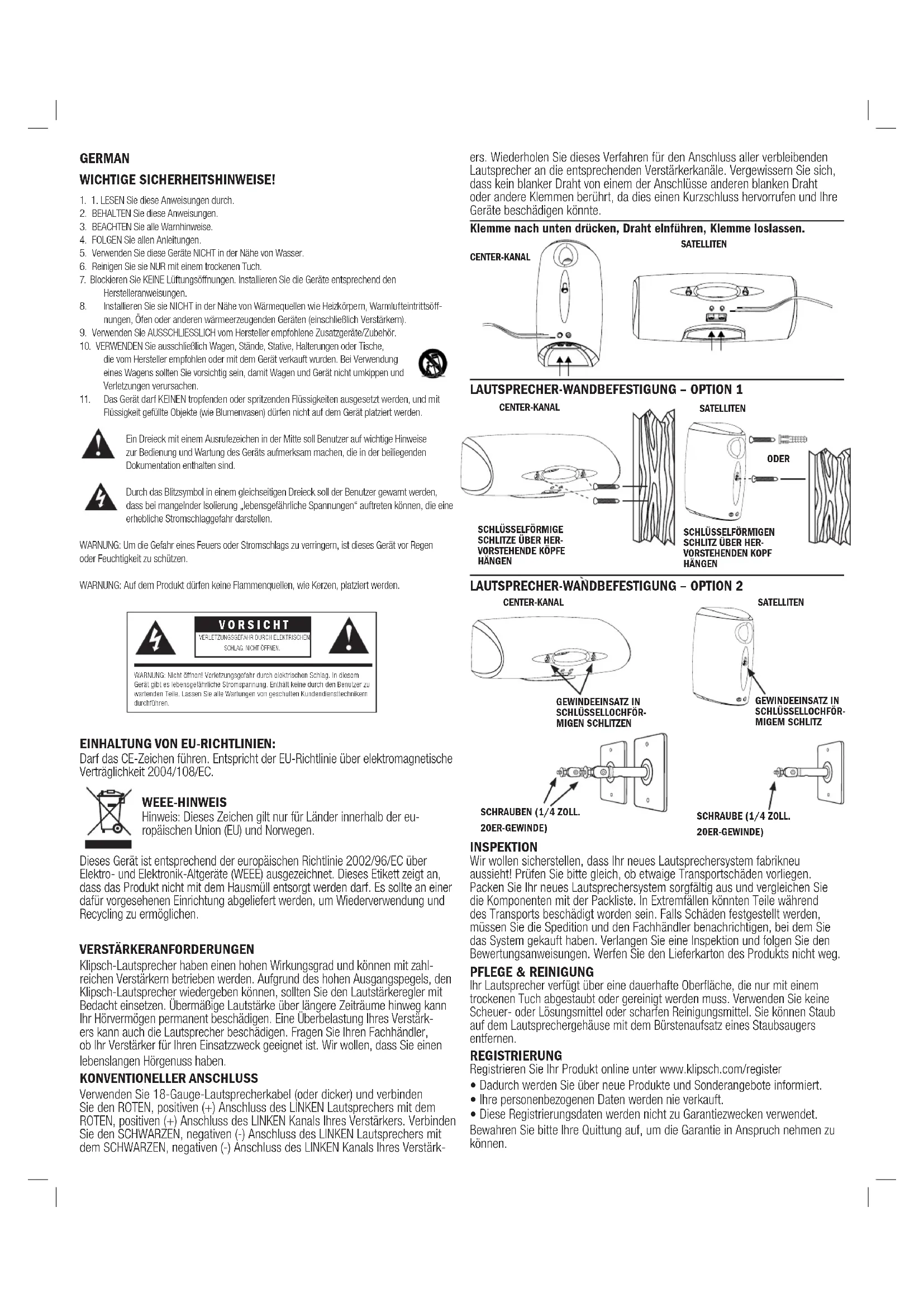 Flüssigkeit gefüllte Objekte (wie Blumenvasen) dürfen nicht auf dem Gerät platziert werden. Ein Dreieck mit einem Ausrufezeichen in der Mitte soll Benutzer auf wichtige Hinweise zur Bedienung und Wartung des Geräts aufmerksam machen, die in der beiliegenden Dokumentation enthalten sind. Durch das Blitzsymbol in einem gleichseitigen Dreieck soll der Benutzer gewarnt werden, dass bei mangelnder Isolierung „lebensgefährliche Spannungen“ auftreten können, die eine erhebliche Stromschlaggefahr darstellen. WARNUNG: Um die Gefahr eines Feuers oder Stromschlags zu verringern, ist dieses Gerät vor Regen oder Feuchtigkeit zu schützen. WARNUNG: Auf dem Produkt dürfen keine Flammenquellen, wie Kerzen, platziert werden. EINHALTUNG VON EU-RICHTLINIEN: Darf das CE-Zeichen führen. Entspricht der EU-Richtlinie über elektromagnetische Verträglichkeit 2004/108/EC. WEEE-HINWEIS Hinweis: Dieses Zeichen gilt nur für Länder innerhalb der eu- ropäischen Union (EU) und Norwegen. Dieses Gerät ist entsprechend der europäischen Richtlinie 2002/96/EC über Elektro- und Elektronik-Altgeräte (WEEE) ausgezeichnet. Dieses Etikett zeigt an, dass das Produkt nicht mit dem Hausmüll entsorgt werden darf. Es sollte an einer dafür vorgesehenen Einrichtung abgeliefert werden, um Wiederverwendung und Recycling zu ermöglichen. VERSTÄRKERANFORDERUNGEN Klipsch-Lautsprecher haben einen hohen Wirkungsgrad und können mit zahl- reichen Verstärkern betrieben werden. Aufgrund des hohen Ausgangspegels, den Klipsch-Lautsprecher wiedergeben können, sollten Sie den Lautstärkeregler mit Bedacht einsetzen. Übermäßige Lautstärke über längere Zeiträume hinweg kann Ihr Hörvermögen permanent beschädigen. Eine Überbelastung Ihres Verstärk- ers kann auch die Lautsprecher beschädigen. Fragen Sie Ihren Fachhändler, ob Ihr Verstärker für Ihren Einsatzzweck geeignet ist. Wir wollen, dass Sie einen lebenslangen Hörgenuss haben. KONVENTIONELLER ANSCHLUSS Verwenden Sie 18-Gauge-Lautsprecherkabel (oder dicker) und verbinden Sie den ROTEN, positiven (+) Anschluss des LINKEN Lautsprechers mit dem ROTEN, positiven (+) Anschluss des LINKEN Kanals Ihres Verstärkers. Verbinden Sie den SCHWARZEN, negativen (-) Anschluss des LINKEN Lautsprechers mit dem SCHWARZEN, negativen (-) Anschluss des LINKEN Kanals Ihres Verstärk- ers. Wiederholen Sie dieses Verfahren für den Anschluss aller verbleibenden Lautsprecher an die entsprechenden Verstärkerkanäle. Vergewissern Sie sich, dass kein blanker Draht von einem der Anschlüsse anderen blanken Draht oder andere Klemmen berührt, da dies einen Kurzschluss hervorrufen und Ihre Geräte beschädigen könnte. Klemme nach unten drücken, Draht einführen, Klemme loslassen. LAUTSPRECHER-WANDBEFESTIGUNG – OPTION 1 LAUTSPRECHER-WANDBEFESTIGUNG – OPTION 2 INSPEKTION Wir wollen sicherstellen, dass Ihr neues Lautsprechersystem fabrikneu aussieht! Prüfen Sie bitte gleich, ob etwaige Transportschäden vorliegen. Packen Sie Ihr neues Lautsprechersystem sorgfältig aus und vergleichen Sie die Komponenten mit der Packliste. In Extremfällen könnten Teile während des Transports beschädigt worden sein. Falls Schäden festgestellt werden, müssen Sie die Spedition und den Fachhändler benachrichtigen, bei dem Sie das System gekauft haben. Verlangen Sie eine Inspektion und folgen Sie den Bewertungsanweisungen. Werfen Sie den Lieferkarton des Produkts nicht weg. PFLEGE & REINIGUNG Ihr Lautsprecher verfügt über eine dauerhafte Oberfläche, die nur mit einem trockenen Tuch abgestaubt oder gereinigt werden muss. Verwenden Sie keine Scheuer- oder Lösungsmittel oder scharfen Reinigungsmittel. Sie können Staub auf dem Lautsprechergehäuse mit dem Bürstenaufsatz eines Staubsaugers entfernen. REGISTRIERUNG Registrieren Sie Ihr Produkt online unter www.klipsch.com/register