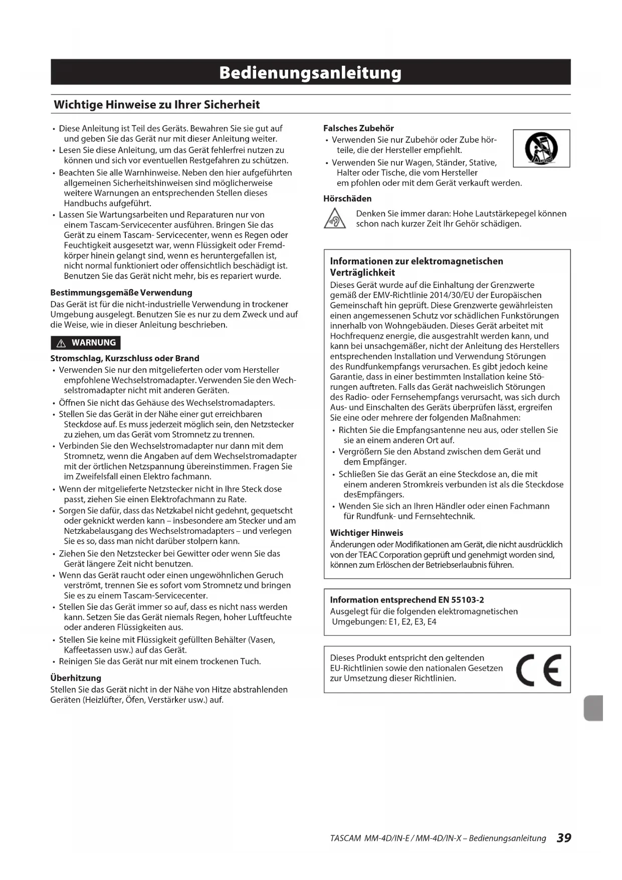- Diese Anleitung ist Teil des Geräts. Bewahren Sie sie gut auf und geben Sie das Gerät nur mit dieser Anleitung weiter.• Lesen Sie diese Anleitung, um das Gerät fehlerfrei nutzen zu können und sich vor eventuellen Restgefahren zu schützen.• Beachten Sie alle Warnhinweise. Neben den hier aufgeführten allgemeinen Sicherheitshinweisen sind möglicherweise weitere Warnungen an entsprechenden Stellen dieses Handbuchs aufgeführt.• Lassen Sie Wartungsarbeiten und Reparaturen nur von einem Tascam-Servicecenter ausführen. Bringen Sie das Gerät zu einem Tascam- Servicecenter, wenn es Regen oder Feuchtigkeit ausgesetzt war, wenn Flüssigkeit oder Fremd-körper hinein gelangt sind, wenn es heruntergefallen ist, nicht normal funktioniert oder offensichtlich beschädigt ist. Benutzen Sie das Gerät nicht mehr, bis es repariert wurde.Bestimmungsgemäße VerwendungDas Gerät ist für die nicht-industrielle Verwendung in trockener Umgebung ausgelegt. Benutzen Sie es nur zu dem Zweck und auf die Weise, wie in dieser Anleitung beschrieben.V WARNUNGStromschlag, Kurzschluss oder Brand• Verwenden Sie nur den mitgelieferten oder vom Hersteller empfohlene Wechselstromadapter. Verwenden Sie den Wech-selstromadapter nicht mit anderen Geräten.• Öffnen Sie nicht das Gehäuse des Wechselstromadapters.• Stellen Sie das Gerät in der Nähe einer gut erreichbaren Steckdose auf. Es muss jederzeit möglich sein, den Netzstecker zu ziehen, um das Gerät vom Stromnetz zu trennen.• Verbinden Sie den Wechselstromadapter nur dann mit dem Stromnetz, wenn die Angaben auf dem Wechselstromadapter mit der örtlichen Netzspannung übereinstimmen. Fragen Sie im Zweifelsfall einen Elektro fachmann.• Wenn der mitgelieferte Netzstecker nicht in Ihre Steck dose passt, ziehen Sie einen Elektrofachmann zu Rate.• Sorgen Sie dafür, dass das Netzkabel nicht gedehnt, gequetscht oder geknickt werden kann – insbesondere am Stecker und am Netzkabelausgang des Wechselstromadapters – und verlegen Sie es so, dass man nicht darüber stolpern kann. • Ziehen Sie den Netzstecker bei Gewitter oder wenn Sie das Gerät längere Zeit nicht benutzen.• Wenn das Gerät raucht oder einen ungewöhnlichen Geruch verströmt, trennen Sie es sofort vom Stromnetz und bringen Sie es zu einem Tascam-Servicecenter.• Stellen Sie das Gerät immer so auf, dass es nicht nass werden kann. Setzen Sie das Gerät niemals Regen, hoher Luftfeuchte oder anderen Flüssigkeiten aus.• Stellen Sie keine mit Flüssigkeit gefüllten Behälter (Vasen, Kaffeetassen usw.) auf das Gerät.• Reinigen Sie das Gerät nur mit einem trockenen Tuch.ÜberhitzungStellen Sie das Gerät nicht in der Nähe von Hitze abstrahlenden Geräten (Heizlüfter, Öfen, Verstärker usw.) auf.Falsches Zubehör• Verwenden Sie nur Zubehör oder Zube hör-teile, die der Hersteller empfiehlt. • Verwenden Sie nur Wagen, Ständer, Stative, Halter oder Tische, die vom Hersteller em pfohlen oder mit dem Gerät verkauft werden.HörschädenDenken Sie immer daran: Hohe Lautstärkepegel können schon nach kurzer Zeit Ihr Gehör schädigen. Informationen zur elektromagnetischen Verträglichkeit Dieses Gerät wurde auf die Einhaltung der Grenzwerte gemäß der EMV-Richtlinie 2014/30/EU der Europäischen Gemeinschaft hin geprüft. Diese Grenzwerte gewährleisten einen angemessenen Schutz vor schädlichen Funkstörungen innerhalb von Wohngebäuden. Dieses Gerät arbeitet mit Hochfrequenz energie, die ausgestrahlt werden kann, und kann bei unsachgemäßer, nicht der Anleitung des Herstellers entsprechenden Installation und Verwendung Störungen des Rundfunkempfangs verursachen. Es gibt jedoch keine Garantie, dass in einer bestimmten Installation keine Stö-rungen auftreten. Falls das Gerät nachweislich Störungen des Radio- oder Fernsehempfangs verursacht, was sich durch Aus- und Einschalten des Geräts überprüfen lässt, ergreifen Sie eine oder mehrere der folgenden Maßnahmen:• Richten Sie die Empfangsantenne neu aus, oder stellen Sie sie an einem anderen Ort auf. • Vergrößern Sie den Abstand zwischen dem Gerät und dem Empfänger. • Schließen Sie das Gerät an eine Steckdose an, die mit einem anderen Stromkreis verbunden ist als die Steckdose des Emp fängers. • Wenden Sie sich an Ihren Händler oder einen Fachmann für Rundfunk- und Fernsehtechnik. Wichtiger HinweisÄnderungen oder Modifikationen am Gerät, die nicht ausdrücklich von der TEAC Corporation geprüft und genehmigt worden sind, können zum Erlöschen der Betriebserlaubnis führen.Information entsprechend EN 55103-2Ausgelegt für die folgenden elektromagnetischen Umgebungen: E1, E2, E3, E4Dieses Produkt entspricht den geltenden EU-Richtlinien sowie den nationalen Gesetzen zur Umsetzung dieser Richtlinien. Wichtige Hinweise zu Ihrer Sicherheit Bedienungsanleitung40 TASCAM MM-4D/IN-E / MM-4D/IN-X – Bedienungsanleitung Das Typenschild befindet sich auf der Unterseite der Geräte, wie in der folgenden Abbildung gezeigt: Vorderseite Typenschild Angaben zur Umweltverträglichkeit und zur Entsorgung Entsorgung von elektrischen und elektronischen von Altgeräten Wenn ein Symbol einer durchgestrichenen Müll- tonne auf einem Produkt, der Verpackung und/ oder der begleitenden Dokumentation ange- bracht ist, unterliegt dieses Produkt den europäi- schen Richtlinien 2012/19/EU und/oder 2006/66/ EG (geändert durch 2013/56/EU) sowie nationalen Gesetzen zur Umsetzung dieser Richtlinien. Richtlinien und Gesetze schreiben vor, dass Elektro- und Elek- tronik-Altgeräte nicht in den Hausmüll (Restmüll) gelangen dürfen. Um die fachgerechte Entsorgung, Aufbereitung und Wiederverwertung sicherzustellen, sind Sie verpflichtet, Alt- geräte über staatlich dafür vorgesehene Stellen zu entsorgen. Durch die ordnungsgemäße Entsorgung solcher Geräte leisten Sie einen Beitrag zur Einsparung wertvoller Rohstoffe und verhindern potenziell schädliche Auswirkungen auf die menschliche Gesundheit und die Umwelt, die durch fal