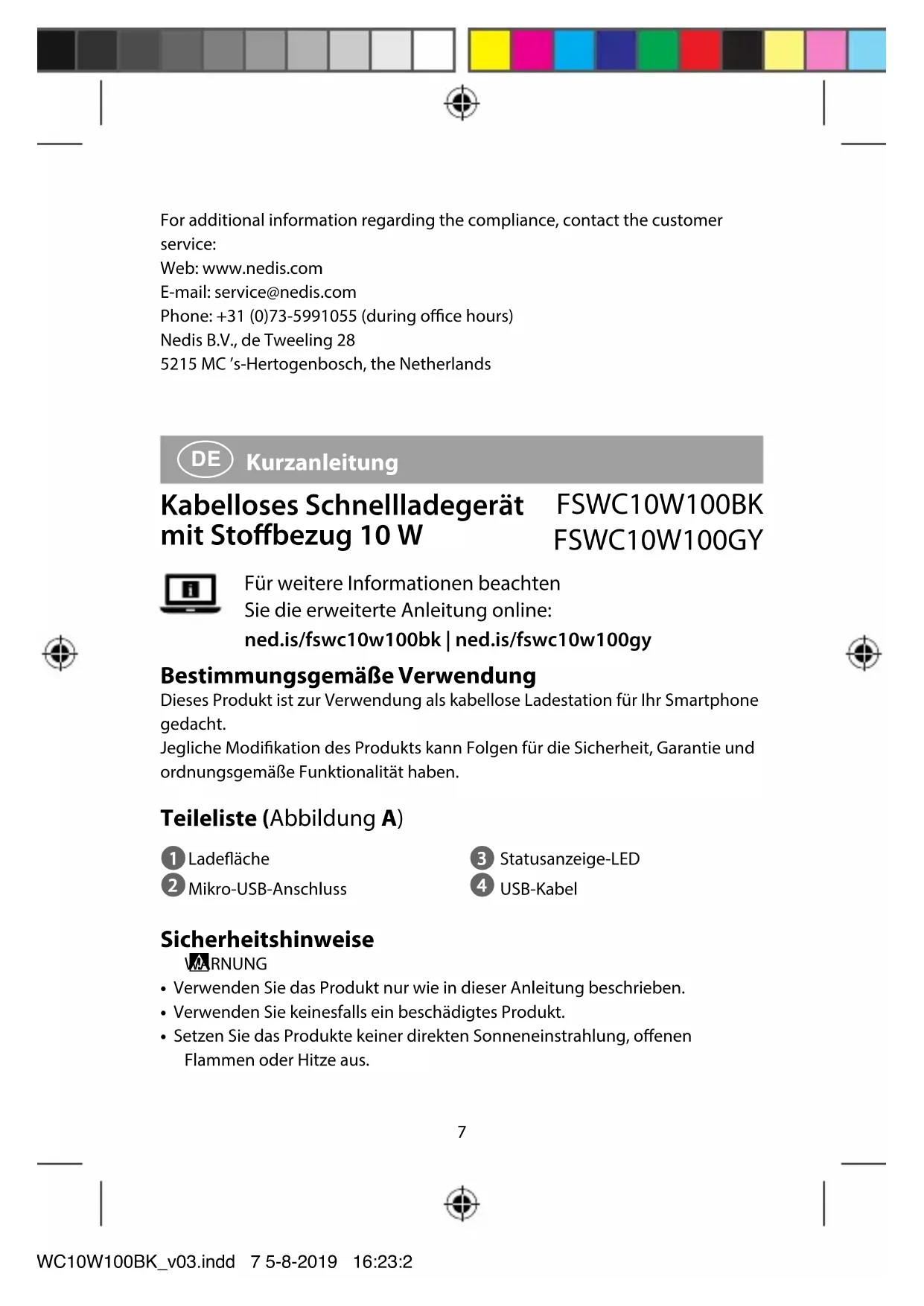 Für weitere Informationen beachten Sie die erweiterte Anleitung online: ned.is/fswc10w100bk | ned.is/fswc10w100gy Bestimmungsgemäße Verwendung Dieses Produkt ist zur Verwendung als kabellose Ladestation für Ihr Smartphone gedacht.Jegliche Modikation des Produkts kann Folgen für die Sicherheit, Garantie und ordnungsgemäße Funktionalität haben. Teileliste (Abbildung A)
