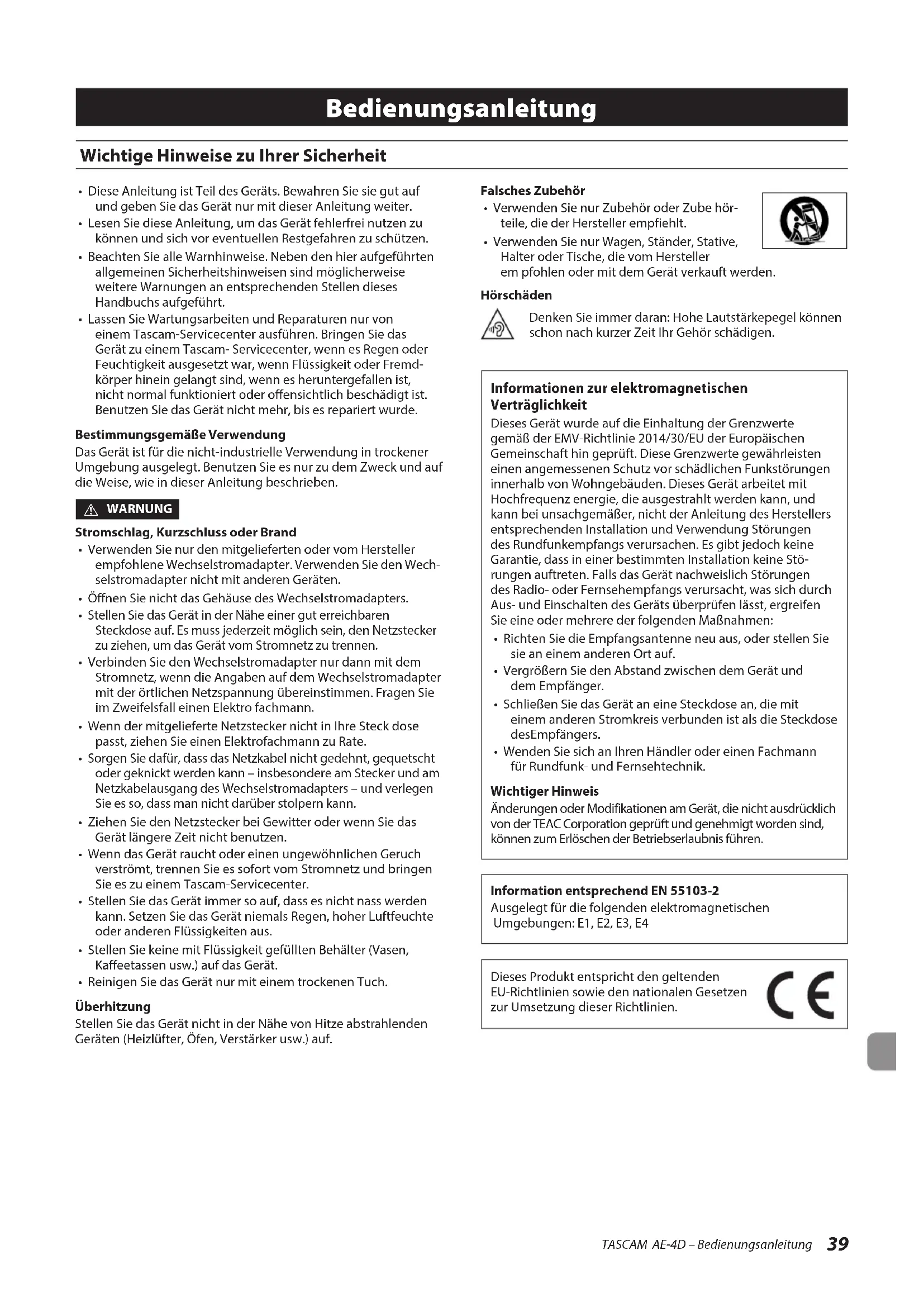 - Diese Anleitung ist Teil des Geräts. Bewahren Sie sie gut auf und geben Sie das Gerät nur mit dieser Anleitung weiter.• Lesen Sie diese Anleitung, um das Gerät fehlerfrei nutzen zu können und sich vor eventuellen Restgefahren zu schützen.• Beachten Sie alle Warnhinweise. Neben den hier aufgeführten allgemeinen Sicherheitshinweisen sind möglicherweise weitere Warnungen an entsprechenden Stellen dieses Handbuchs aufgeführt.• Lassen Sie Wartungsarbeiten und Reparaturen nur von einem Tascam-Servicecenter ausführen. Bringen Sie das Gerät zu einem Tascam- Servicecenter, wenn es Regen oder Feuchtigkeit ausgesetzt war, wenn Flüssigkeit oder Fremd-körper hinein gelangt sind, wenn es heruntergefallen ist, nicht normal funktioniert oder offensichtlich beschädigt ist. Benutzen Sie das Gerät nicht mehr, bis es repariert wurde.Bestimmungsgemäße VerwendungDas Gerät ist für die nicht-industrielle Verwendung in trockener Umgebung ausgelegt. Benutzen Sie es nur zu dem Zweck und auf die Weise, wie in dieser Anleitung beschrieben.V WARNUNGStromschlag, Kurzschluss oder Brand• Verwenden Sie nur den mitgelieferten oder vom Hersteller empfohlene Wechselstromadapter. Verwenden Sie den Wech-selstromadapter nicht mit anderen Geräten.• Öffnen Sie nicht das Gehäuse des Wechselstromadapters.• Stellen Sie das Gerät in der Nähe einer gut erreichbaren Steckdose auf. Es muss jederzeit möglich sein, den Netzstecker zu ziehen, um das Gerät vom Stromnetz zu trennen.• Verbinden Sie den Wechselstromadapter nur dann mit dem Stromnetz, wenn die Angaben auf dem Wechselstromadapter mit der örtlichen Netzspannung übereinstimmen. Fragen Sie im Zweifelsfall einen Elektro fachmann.• Wenn der mitgelieferte Netzstecker nicht in Ihre Steck dose passt, ziehen Sie einen Elektrofachmann zu Rate.• Sorgen Sie dafür, dass das Netzkabel nicht gedehnt, gequetscht oder geknickt werden kann – insbesondere am Stecker und am Netzkabelausgang des Wechselstromadapters – und verlegen Sie es so, dass man nicht darüber stolpern kann. • Ziehen Sie den Netzstecker bei Gewitter oder wenn Sie das Gerät längere Zeit nicht benutzen.• Wenn das Gerät raucht oder einen ungewöhnlichen Geruch verströmt, trennen Sie es sofort vom Stromnetz und bringen Sie es zu einem Tascam-Servicecenter.• Stellen Sie das Gerät immer so auf, dass es nicht nass werden kann. Setzen Sie das Gerät niemals Regen, hoher Luftfeuchte oder anderen Flüssigkeiten aus.• Stellen Sie keine mit Flüssigkeit gefüllten Behälter (Vasen, Kaffeetassen usw.) auf das Gerät.• Reinigen Sie das Gerät nur mit einem trockenen Tuch.ÜberhitzungStellen Sie das Gerät nicht in der Nähe von Hitze abstrahlenden Geräten (Heizlüfter, Öfen, Verstärker usw.) auf.Falsches Zubehör• Verwenden Sie nur Zubehör oder Zube hör-teile, die der Hersteller empfiehlt. • Verwenden Sie nur Wagen, Ständer, Stative, Halter oder Tische, die vom Hersteller em pfohlen oder mit dem Gerät verkauft werden.HörschädenDenken Sie immer daran: Hohe Lautstärkepegel können schon nach kurzer Zeit Ihr Gehör schädigen. Informationen zur elektromagnetischen Verträglichkeit Dieses Gerät wurde auf die Einhaltung der Grenzwerte gemäß der EMV-Richtlinie 2014/30/EU der Europäischen Gemeinschaft hin geprüft. Diese Grenzwerte gewährleisten einen angemessenen Schutz vor schädlichen Funkstörungen innerhalb von Wohngebäuden. Dieses Gerät arbeitet mit Hochfrequenz energie, die ausgestrahlt werden kann, und kann bei unsachgemäßer, nicht der Anleitung des Herstellers entsprechenden Installation und Verwendung Störungen des Rundfunkempfangs verursachen. Es gibt jedoch keine Garantie, dass in einer bestimmten Installation keine Stö-rungen auftreten. Falls das Gerät nachweislich Störungen des Radio- oder Fernsehempfangs verursacht, was sich durch Aus- und Einschalten des Geräts überprüfen lässt, ergreifen Sie eine oder mehrere der folgenden Maßnahmen:• Richten Sie die Empfangsantenne neu aus, oder stellen Sie sie an einem anderen Ort auf. • Vergrößern Sie den Abstand zwischen dem Gerät und dem Empfänger. • Schließen Sie das Gerät an eine Steckdose an, die mit einem anderen Stromkreis verbunden ist als die Steckdose des Emp fängers. • Wenden Sie sich an Ihren Händler oder einen Fachmann für Rundfunk- und Fernsehtechnik. Wichtiger HinweisÄnderungen oder Modifikationen am Gerät, die nicht ausdrücklich von der TEAC Corporation geprüft und genehmigt worden sind, können zum Erlöschen der Betriebserlaubnis führen.Information entsprechend EN 55103-2Ausgelegt für die folgenden elektromagnetischen Umgebungen: E1, E2, E3, E4Dieses Produkt entspricht den geltenden EU-Richtlinien sowie den nationalen Gesetzen zur Umsetzung dieser Richtlinien. Wichtige Hinweise zu Ihrer Sicherheit Bedienungsanleitung40 TASCAM AE-4D – Bedienungsanleitung Das Typenschild befindet sich auf der Unterseite der Geräte, wie in der folgenden Abbildung gezeigt: Vorderseite Typenschild Angaben zur Umweltverträglichkeit und zur Entsorgung Entsorgung von elektrischen und elektronischen von Altgeräten Wenn ein Symbol einer durchgestrichenen Müll- tonne auf einem Produkt, der Verpackung und/ oder der begleitenden Dokumentation ange- bracht ist, unterliegt dieses Produkt den europäi- schen Richtlinien 2012/19/EU und/oder 2006/66/ EG (geändert durch 2013/56/EU) sowie nationalen Gesetzen zur Umsetzung dieser Richtlinien. Richtlinien und Gesetze schreiben vor, dass Elektro- und Elek- tronik-Altgeräte nicht in den Hausmüll (Restmüll) gelangen dürfen. Um die fachgerechte Entsorgung, Aufbereitung und Wiederverwertung sicherzustellen, sind Sie verpflichtet, Alt- geräte über staatlich dafür vorgesehene Stellen zu entsorgen. Durch die ordnungsgemäße Entsorgung solcher Geräte leisten Sie einen Beitrag zur Einsparung wertvoller Rohstoffe und verhindern potenziell schädliche Auswirkungen auf die menschliche Gesundheit und die Umwelt, die durch falsche Abfallentsorg