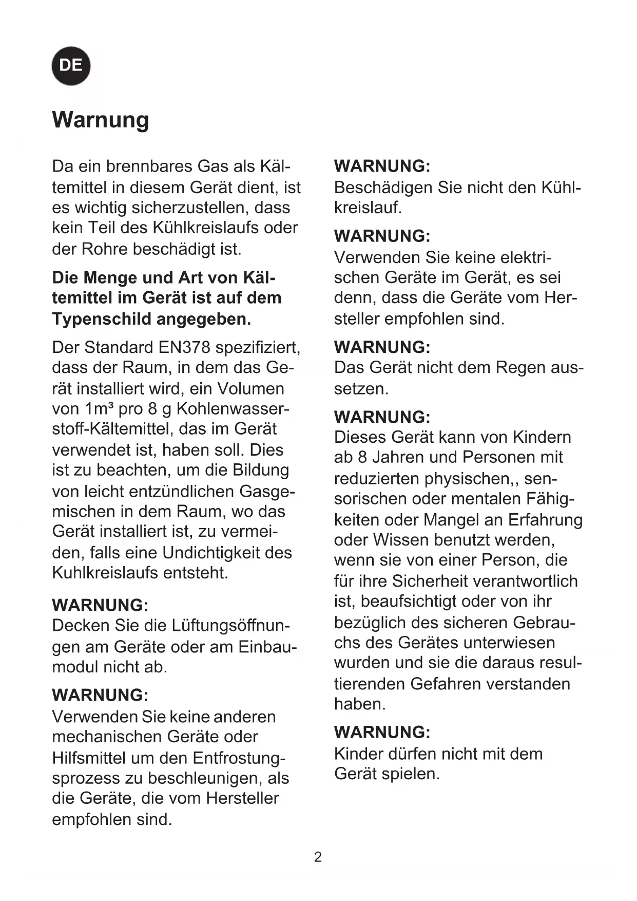 Warnung WARNUNG: Beschädigen Sie nicht den Kühl- kreislauf. WARNUNG: Verwenden Sie keine elektri- schen Geräte im Gerät, es sei denn, dass die Geräte vom Her- steller empfohlen sind. WARNUNG: Das Gerät nicht dem Regen aus- setzen. WARNUNG: Dieses Gerät kann von Kindern ab 8 Jahren und Personen mit reduzierten physischen,, sen- sorischen oder mentalen Fähig- keiten oder Mangel an Erfahrung oder Wissen benutzt werden, wenn sie von einer Person, die für ihre Sicherheit verantwortlich ist, beaufsichtigt oder von ihr bezüglich des sicheren Gebrau- chs des Gerätes unterwiesen wurden und sie die daraus resul- tierenden Gefahren verstanden haben. WARNUNG: Kinder dürfen nicht mit dem Gerät spielen. Da ein brennbares Gas als Käl- temittel in diesem Gerät dient, ist es wichtig sicherzustellen, dass kein Teil des Kühlkreislaufs oder der Rohre beschädigt ist. Die Menge und Art von Käl- temittel im Gerät ist auf dem Typenschild angegeben. Der Standard EN378 speziziert, dass der Raum, in dem das Ge- rät installiert wird, ein Volumen von 1m³ pro 8 g Kohlenwasser- sto-Kältemittel, das im Gerät verwendet ist, haben soll. Dies ist zu beachten, um die Bildung von leicht entzündlichen Gasge- mischen in dem Raum, wo das Gerät installiert ist, zu vermei- den, falls eine Undichtigkeit des Kuhlkreislaufs entsteht. WARNUNG: Decken Sie die Lüftungsönun- gen am Geräte oder am Einbau- modul nicht ab. WARNUNG: Verwenden Sie keine anderen mechanischen Geräte oder Hilfsmittel um den Entfrostung- sprozess zu beschleunigen, als die Geräte, die vom Hersteller empfohlen sind.3