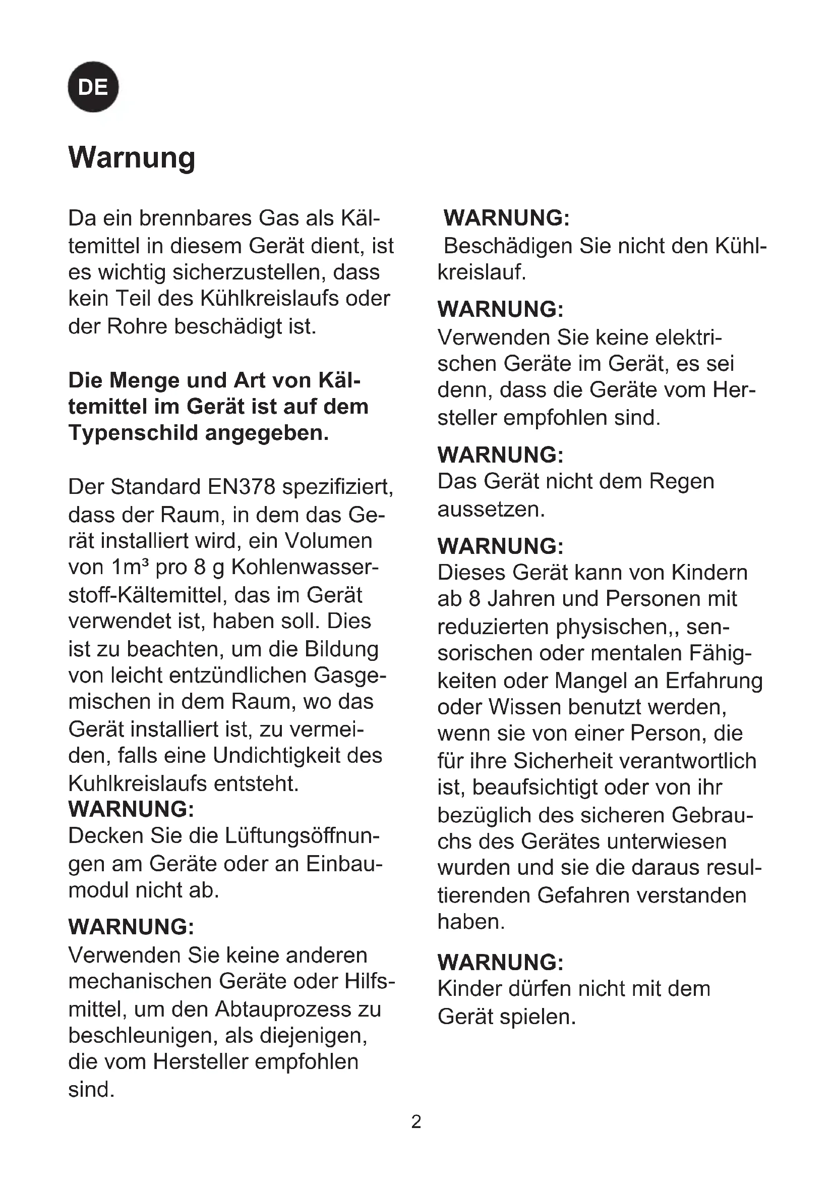Warnung WARNUNG: Beschädigen Sie nicht den Kühl- kreislauf. WARNUNG: Verwenden Sie keine elektri- schen Geräte im Gerät, es sei denn, dass die Geräte vom Her- steller empfohlen sind. WARNUNG: Das Gerät nicht dem Regen aussetzen. WARNUNG: Dieses Gerät kann von Kindern ab 8 Jahren und Personen mit reduzierten physischen,, sen- sorischen oder mentalen Fähig- keiten oder Mangel an Erfahrung oder Wissen benutzt werden, wenn sie von einer Person, die für ihre Sicherheit verantwortlich ist, beaufsichtigt oder von ihr bezüglich des sicheren Gebrau- chs des Gerätes unterwiesen wurden und sie die daraus resul- tierenden Gefahren verstanden haben. WARNUNG: Kinder dürfen nicht mit dem Gerät spielen. Da ein brennbares Gas als Käl- temittel in diesem Gerät dient, ist es wichtig sicherzustellen, dass kein Teil des Kühlkreislaufs oder der Rohre beschädigt ist. Die Menge und Art von Käl- temittel im Gerät ist auf dem Typenschild angegeben. Der Standard EN378 speziziert, dass der Raum, in dem das Ge- rät installiert wird, ein Volumen von 1m³ pro 8 g Kohlenwasser- sto-Kältemittel, das im Gerät verwendet ist, haben soll. Dies ist zu beachten, um die Bildung von leicht entzündlichen Gasge- mischen in dem Raum, wo das Gerät installiert ist, zu vermei- den, falls eine Undichtigkeit des Kuhlkreislaufs entsteht. WARNUNG: Decken Sie die Lüftungsönun- gen am Geräte oder an Einbau- modul nicht ab. WARNUNG: Verwenden Sie keine anderen mechanischen Geräte oder Hilfs- mittel, um den Abtauprozess zu beschleunigen, als diejenigen, die vom Hersteller empfohlen sind.3
