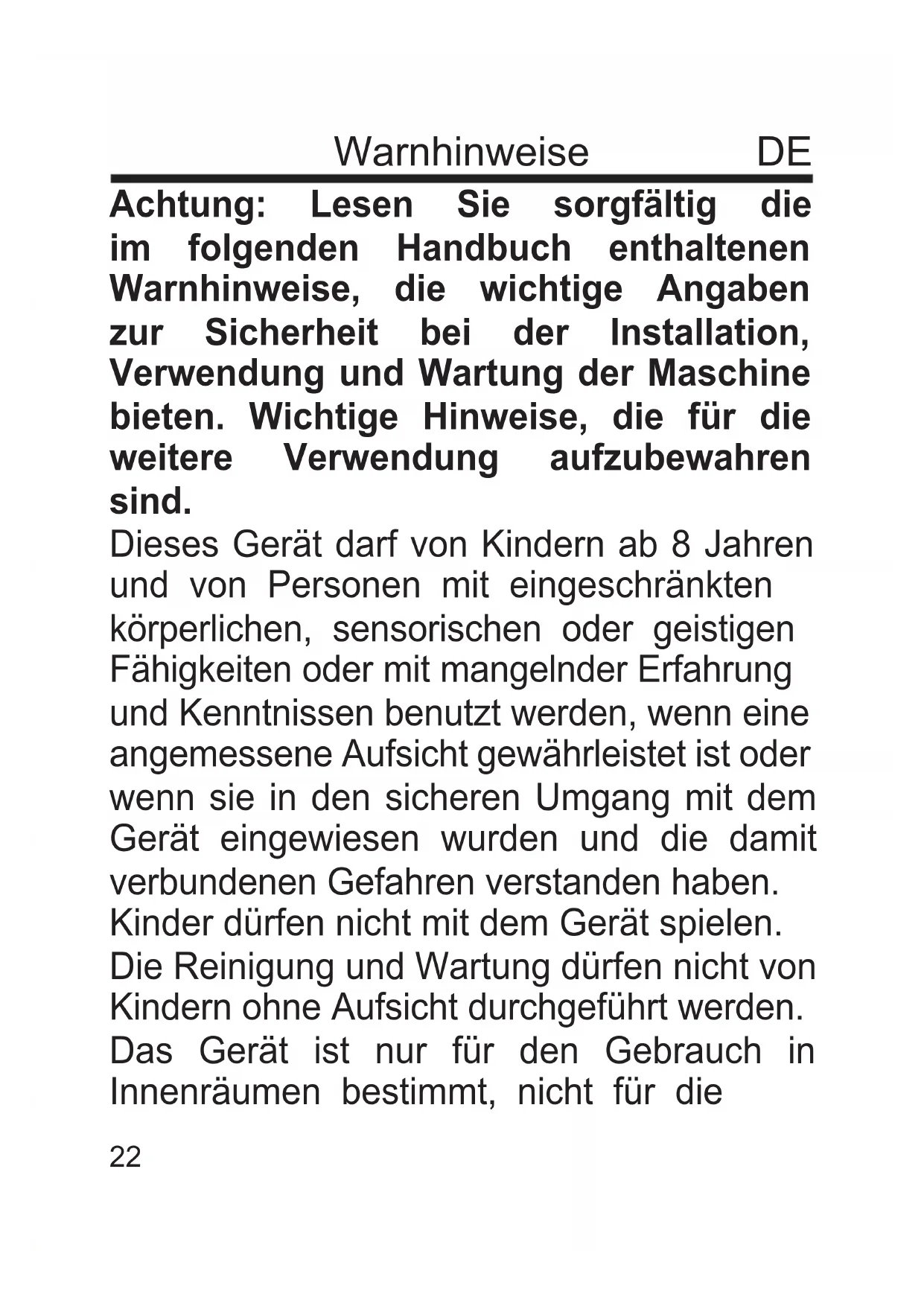 “Umsetzung der Richtlinie 2012/19/EU über Elektro- und Elektronik-Altgeräte (WEEE)” zur Verringerung der Verwendung gefährlicher Stoe in Elektro- und Elektronikgeräten sowie zur Abfallentsorgung. Das Symbol der durchgestrichenen Mülltonne auf dem Gerät oder seiner Verpackung weist darauf hin, dass das Produkt am Ende seiner Lebensdauer getrennt von anderen Abfällen entsorgt werden muss. Der Benutzer muss daher die ausgemusterten Geräte zu geeigneten getrennten Sammelstellen für Elektro- und Elektronikabfälle bringen. Für weitere Einzelheiten wenden Sie sich bitte an die zuständige lokale Behörde. Eine geeignete getrennte Sammlung der Geräte für das spätere Recycling, die Verarbeitung oder die umweltfreundliche Entsorgung trägt dazu bei, Schäden an der Umwelt und der menschlichen Gesundheit zu vermeiden, und fördert die Wiederverwendung und/oder das Recycling der Materialien, aus denen die Geräte bestehen. Eine widerrechtliche Entsorgung des Produkts durch den Benutzer hat die Anwendung von Verwaltungsstrafen gemäß den geltenden Gesetzen zur Folge. BENUTZERINFORMATIONEN VERPACKUNG Um die Umwelt zu schonen, muss das Verpackungsmaterial ordnungsgemäß in einer getrennten Sammlung entsorgt werden. Prüfen Sie die örtlichen Vorschriften.28 GARANTIESCHEIN Garantiebedingungen: Die Garantie dauert 24 Monate vom Einkaufsdatum. Dieser Garantieschein hat nur Gültigkeit, wenn er ordnungsgemäß ausgefüllt und zusammen mit dem Kassenzettel vorgelegt wird. Die Garantie umfaßt den Ersatz oder die Reparatur aller Komponenten des Gerätes im Falle von Herstellungsfehlern. Das Gerät wird ausschließlich nur von einem unserer autorisierten Kundendienststellen zurückgenommen. Außerdem garantieren wir für fachgerechte Dienstleistung (gegen Bezahlung) auch außerhalb der Garantiezeit. Die Herstellungsrma lehnt jede Verantwortung hinsichtlich Schäden an Personen, Tieren oder Gegenständen ab, die durch unsachgemäße Benutzung des Geräts oder Nichtbefolgen der beiliegenden Bedienungs-anleitung entstehen. Einschränkungen: Der Garantieanspruch bzw. unsere Verantwortlichkeit erlischt, wenn das Gerät: - von nicht autorisierten Personen demontiert wurde; - in unsachgemäßer oder unnormaler Weise zum Einsatz kam, aufbewahrt oder transportiert wurde. Weiterhin sind von der Garantie alle äußeren Abnutzungserscheinungen am Gerät, die die Funktion des Gerätes nicht beeinträchtigen, ausgeschlossen. Sollten, trotz der Sorgfalt bei der Auswahl der Materialien und trotz der Bemühungen bei der Realisierung des Produktes, das Sie erst gerade erworben haben, Defekte gefunden werden oder sollten Sie irgendwelche Informationen benötigen, so empfehlen wir Ihnen, sich an den für Ihr Gebiet zuständigen Fachhändler zu wenden.29 Advertencias Atención: leer atentamente las advertencias contenidas en el siguiente manual ya que suministran indicaciones importantes en cuanto a la seguridad de la instalación, de uso y de mantenimiento. Instrucciones importantes que deben conservarse para consultas adicionales. Este aparato puede ser utilizado por niños de 8 años en adelante y por personas con capacidades físicas, sensoriales o mentales reducidas o con falta de experiencia o conocimiento si se les asegura una adecuada vigilancia o si han recibido instrucciones acerca del uso con seguridad del aparato y han comprendido los peligros relacionados. Los niños no deben jugar con el aparato. Las operaciones de limpieza y de mantenimiento no deben ser efectuadas por niños sin vigilancia. El aparato está previsto solo para uso en interiores, no usar al abierto. El aparato debe mantenerse fuera del ES30 alcance de los niños. El aparato no debe ser utilizado dentro de graneros, establos y ambientes similares. El aparato no debe ser usado en ambientes donde podría haber presente vapores inamables o polvos explosivos. La lámpara puede ser sustituida solo en los centros de asistencia autorizados por el fabricante, de modo de prevenir todo riesgo. Si el cable de alimentación se dañara, debe ser sustituido solamente en los centros de asistencia autorizados por el fabricante de modo de prevenir todo riesgo.