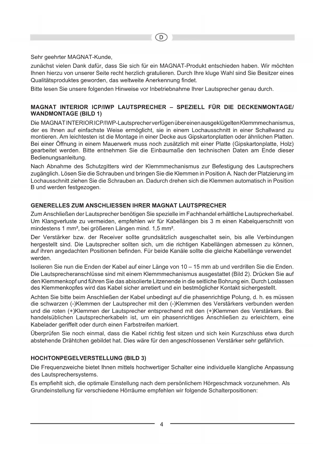 Zum Anschließen der Lautsprecher benötigen Sie spezielle im Fachhandel erhältliche Lautsprecherkabel. Um Klangverluste zu vermeiden, empfehlen wir für Kabellängen bis 3 m einen Kabelquerschnitt von mindestens 1 mm², bei größeren Längen mind. 1,5 mm². Der Verstärker bzw. der Receiver sollte grundsätzlich ausgeschaltet sein, bis alle Verbindungen hergestellt sind. Die Lautsprecher sollten sich, um die richtigen Kabellängen abmessen zu können, auf ihren angedachten Positionen benden. Für beide Kanäle sollte die gleiche Kabellänge verwendet werden. Isolieren Sie nun die Enden der Kabel auf einer Länge von 10 – 15 mm ab und verdrillen Sie die Enden. Die Lautsprecheranschlüsse sind mit einem Klemmmechanismus ausgestattet (Bild 2). Drücken Sie auf den Klemmenkopf und führen Sie das abisolierte Litzenende in die seitliche Bohrung ein. Durch Loslassen des Klemmenkopfes wird das Kabel sicher arretiert und ein bestmöglicher Kontakt sichergestellt. Achten Sie bitte beim Anschließen der Kabel unbedingt auf die phasenrichtige Polung, d. h. es müssen die schwarzen (-)Klemmen der Lautsprecher mit den (-)Klemmen des Verstärkers verbunden werden und die roten (+)Klemmen der Lautsprecher entsprechend mit den (+)Klemmen des Verstärkers. Bei handelsüblichen Lautsprecherkabeln ist, um ein phasenrichtiges Anschließen zu erleichtern, eine Kabelader geriffelt oder durch einen Farbstreifen markiert. Überprüfen Sie noch einmal, dass die Kabel richtig fest sitzen und sich kein Kurzschluss etwa durch abstehende Drähtchen gebildet hat. Dies wäre für den angeschlossenen Verstärker sehr gefährlich. HOCHTONPEGELVERSTELLUNG (BILD 3) Die Frequenzweiche bietet Ihnen mittels hochwertiger Schalter eine individuelle klangliche Anpassung des Lautsprechersystems. Es empehlt sich, die optimale Einstellung nach dem persönlichem Hörgeschmack vorzunehmen. Als Grundeinstellung für verschiedene Hörräume empfehlen wir folgende Schalterpositionen:Hörraum Beispiel Schalterposition Gering schalldämpfende Einrichtung Feuchträume, harte Reexionsächen, Fliesen, große Glasächen, Räume mit geringer Möblierung -2dB Normal schalldämpfende Einrichtung Teppichböden, Glasächen mit Vorhang, Ledereinrichtungen, Räume mit normaler Möblierung 0dB Stark schalldämpfende Einrichtung Teppichböden, Polster-einrichtungen, schwere Vorhänge, Räume mit starker Möblierung +2dB Interior ICP 82/ICP 62/ICP 52/IWP 82/IWP 62: Der Höchtöner lässt sich Dank „Swivel“-Technologie bis zu 35 Grad schwenken, um somit ein ideales Abstrahlverhalten zu erzielen und eine perfekte Ausrichtung auf den Hörplatz zu ermöglichen:
