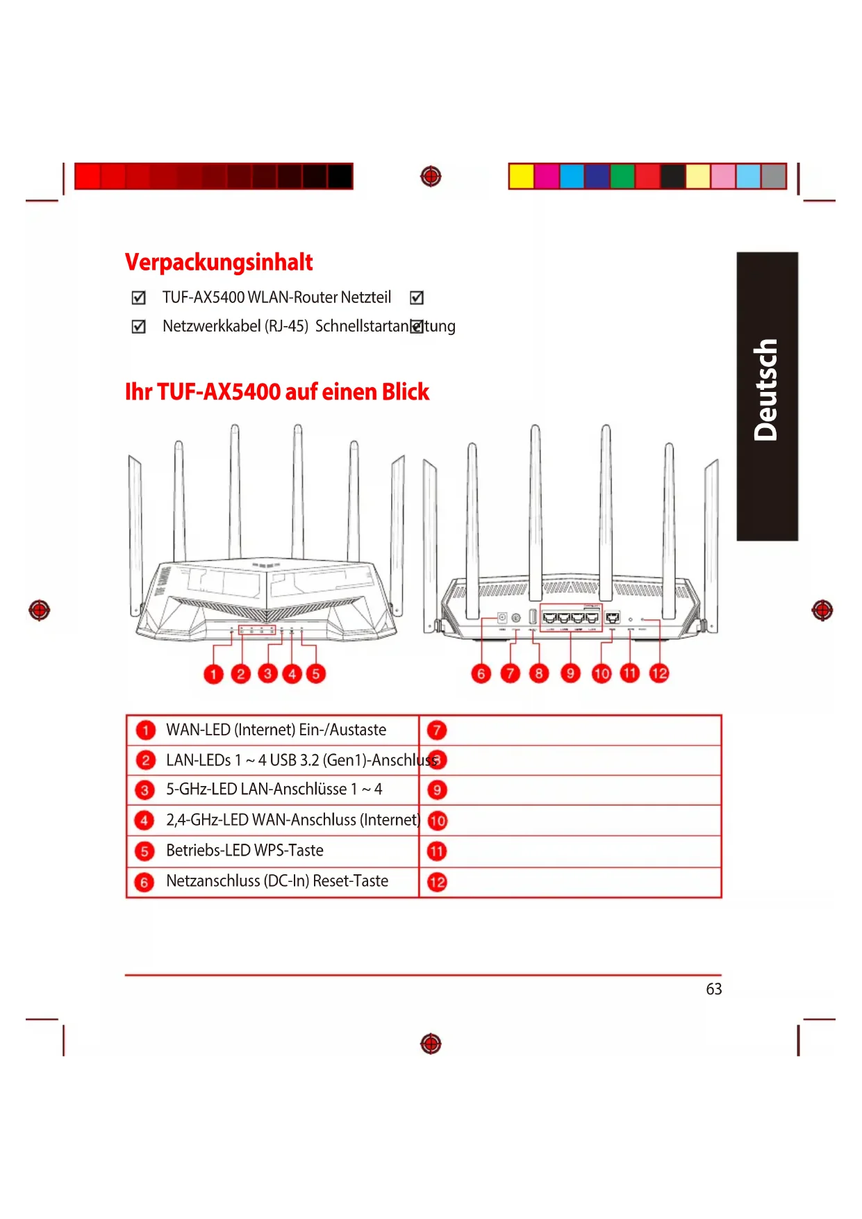 Deutsch Ihr TUF-AX5400 auf einen Blick Ihr TUF-AX5400 auf einen Blick WAN-LED (Internet) Ein-/Austaste LAN-LEDs 1 ~ 4 USB 3.2 (Gen1)-Anschluss 5-GHz-LED LAN-Anschlüsse 1 ~ 4 2,4-GHz-LED WAN-Anschluss (Internet) Betriebs-LED WPS-Taste Netzanschluss (DC-In) Reset-Taste Verpackungsinhalt Verpackungsinhalt TUF-AX5400 WLAN-Router Netzteil Netzwerkkabel (RJ-45) Schnellstartanleitung