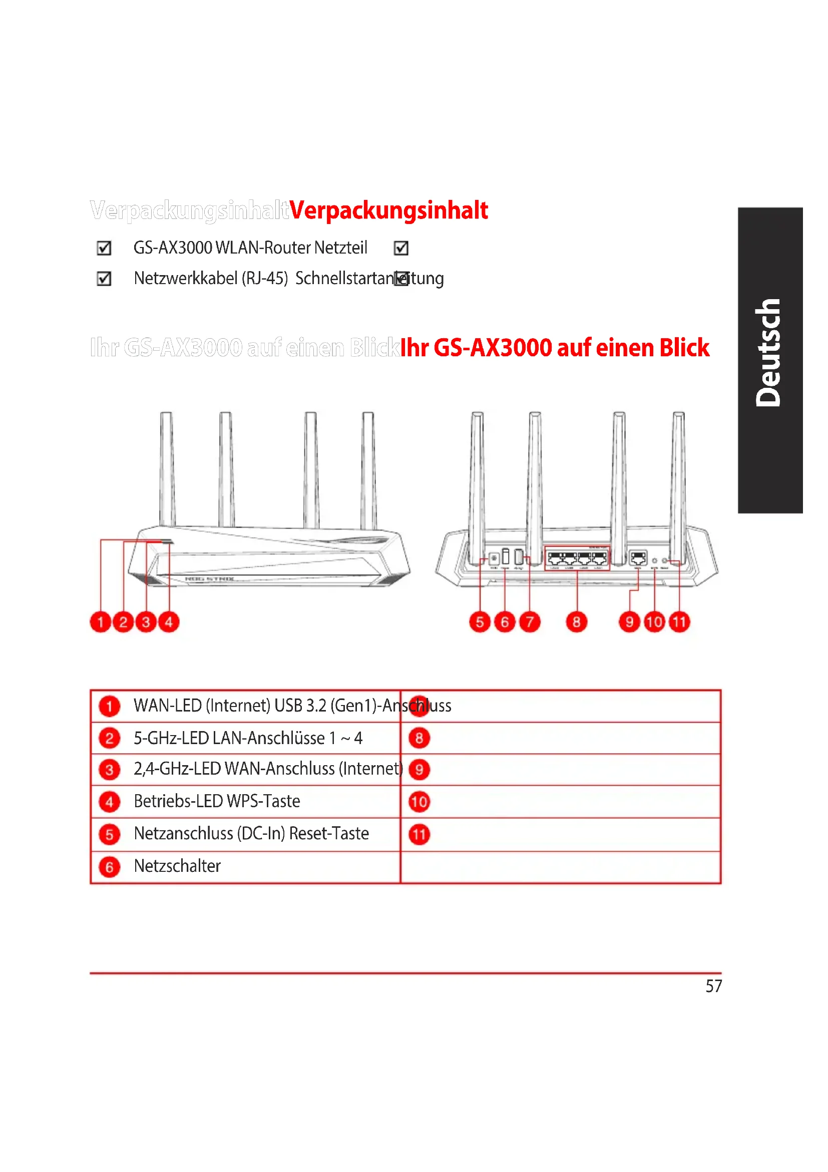 - Voit hakea online-käyttöoppaan osoitteesta https://www.asus.com/support57 Deutsch Ihr GS-AX3000 auf einen BlickIhr GS-AX3000 auf einen Blick WAN-LED (Internet) USB 3.2 (Gen1)-Anschluss 5-GHz-LED LAN-Anschlüsse 1 ~ 4 2,4-GHz-LED WAN-Anschluss (Internet) Betriebs-LED WPS-Taste Netzanschluss (DC-In) Reset-Taste Netzschalter VerpackungsinhaltVerpackungsinhalt GS-AX3000 WLAN-Router Netzteil Netzwerkkabel (RJ-45) Schnellstartanleitung58 Deutsch Platzieren Sie Ihren WLAN-RouterPlatzieren Sie Ihren WLAN-Router Stellen Sie für eine optimale WLAN-Übertragung zwischen dem WLAN-Router und den verbundenen WLAN-Geräten folgendes sicher: