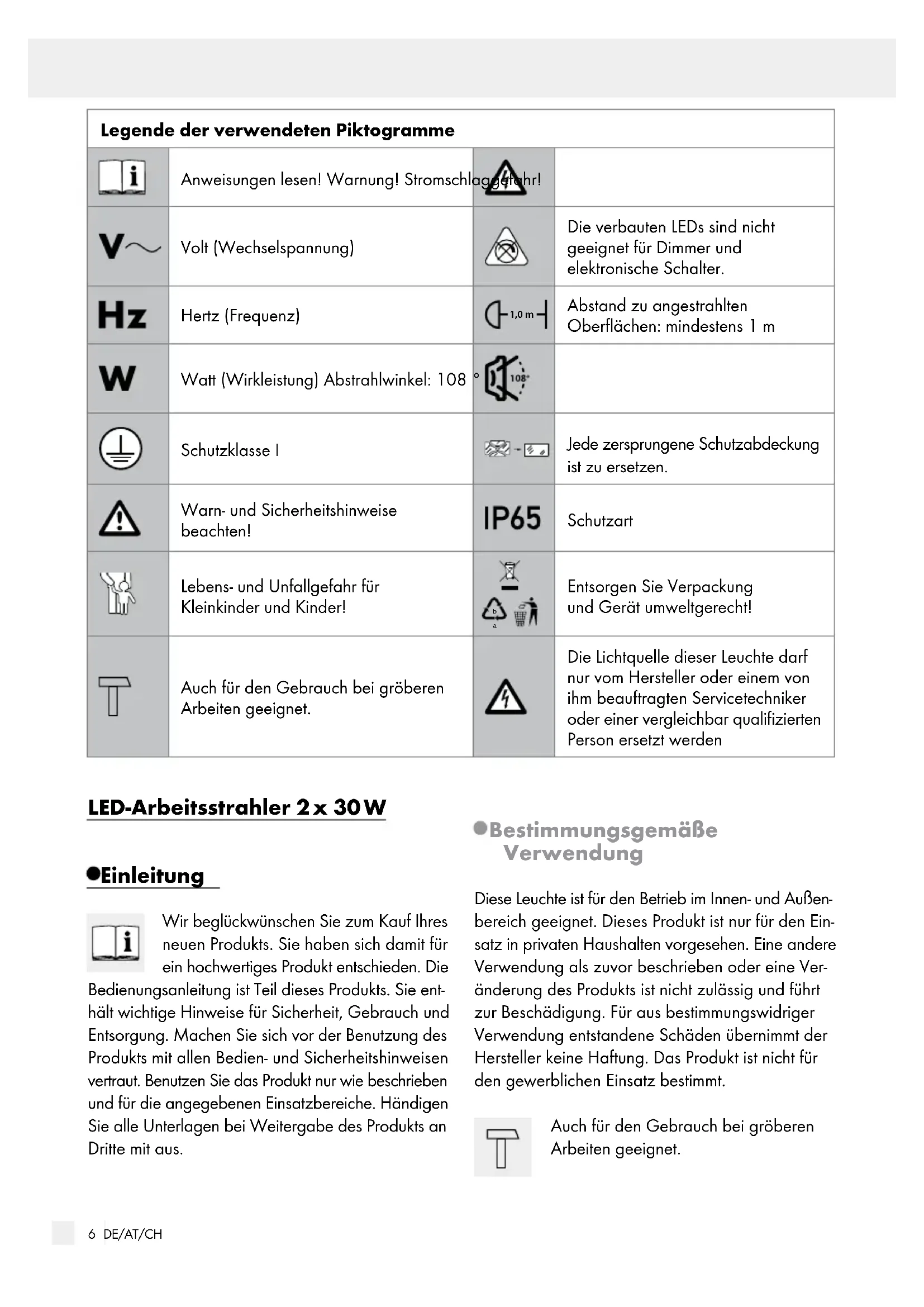 65 DE/AT/CH Legende der verwendeten Piktogramme ........................................................... Seite 6 Einleitung ......................................................................................................................................... Seite 6 Bestimmungsgemäße Verwendung ....................................................................................................Seite 6 Lieferumfang ........................................................................................................................................ Seite 7 Teilebeschreibung ...............................................................................................................................Seite 7 Technische Daten ................................................................................................................................Seite 7 Sicherheitshinweise ................................................................................................................Seite 7 Montage ...........................................................................................................................................Seite 8 Strahler und Griffstück auf Montagehalterung montieren ................................................................ Seite 8 Dreibeinstativ aufstellen ...................................................................................................................... Seite 8 Höhe des Dreibeinstativs einstellen....................................................................................................Seite 9 Arbeitsleuchte auf Dreibeinstativ montieren ......................................................................................Seite 9 Arbeitsleuchte demontieren ................................................................................................................ Seite 9 Bedienung ......................................................................................................................................Seite 9 Leuchte verwenden .............................................................................................................................Seite 9 Wartung und Reinigung .....................................................................................................Seite 9 Entsorgung .....................................................................................................................................Seite 10 Garantie und Service ............................................................................................................Seite 10 Garantie ..............................................................................................................................................Seite 10 Serviceadresse ....................................................................................................................................Seite 106 DE/AT/CH LED-Arbeitsstrahler 2 x 30 W Einleitung Wir beglückwünschen Sie zum Kauf Ihres neuen Produkts. Sie haben sich damit für ein hochwertiges Produkt entschieden. Die Bedienungsanleitung ist Teil dieses Produkts. Sie ent- hält wichtige Hinweise für Sicherheit, Gebrauch und Entsorgung. Machen Sie sich vor der Benutzung des Produkts mit allen Bedien- und Sicherheitshinweisen vertraut. Benutzen Sie das Produkt nur wie beschrieben und für die angegebenen Einsatzbereiche. Händigen Sie alle Unterlagen bei Weitergabe des Produkts an Dritte mit aus. Bestimmungsgemäße Verwendung Diese Leuchte ist für den Betrieb im Innen- und Außen- bereich geeignet. Dieses Produkt ist nur für den Ein- satz in privaten Haushalten vorgesehen. Eine andere Verwendung als zuvor beschrieben oder eine Ver- änderung des Produkts ist nicht zulässig und führt zur Beschädigung. Für aus bestimmungswidriger Verwendung entstandene Schäden übernimmt der Hersteller keine Haftung. Das Produkt ist nicht für den gewerblichen Einsatz bestimmt. Auch für den Gebrauch bei gröberen Arbeiten geeignet. Legende der verwendeten Piktogramme Anweisungen lesen! Warnung! Stromschlaggefahr! Volt (Wechselspannung) Die verbauten LEDs sind nicht geeignet für Dimmer und elektronische Schalter. Hertz (Frequenz) 1,0 m Abstand zu angestrahlten Oberflächen: mindestens 1 m Watt (Wirkleistung) Abstrahlwinkel: 108 ° Schutzklasse I Jede zersprungene Schutzabdeckung ist zu ersetzen. Warn- und Sicherheitshinweise beachten! Schutzart Lebens- und Unfallgefahr für Kleinkinder und Kinder!