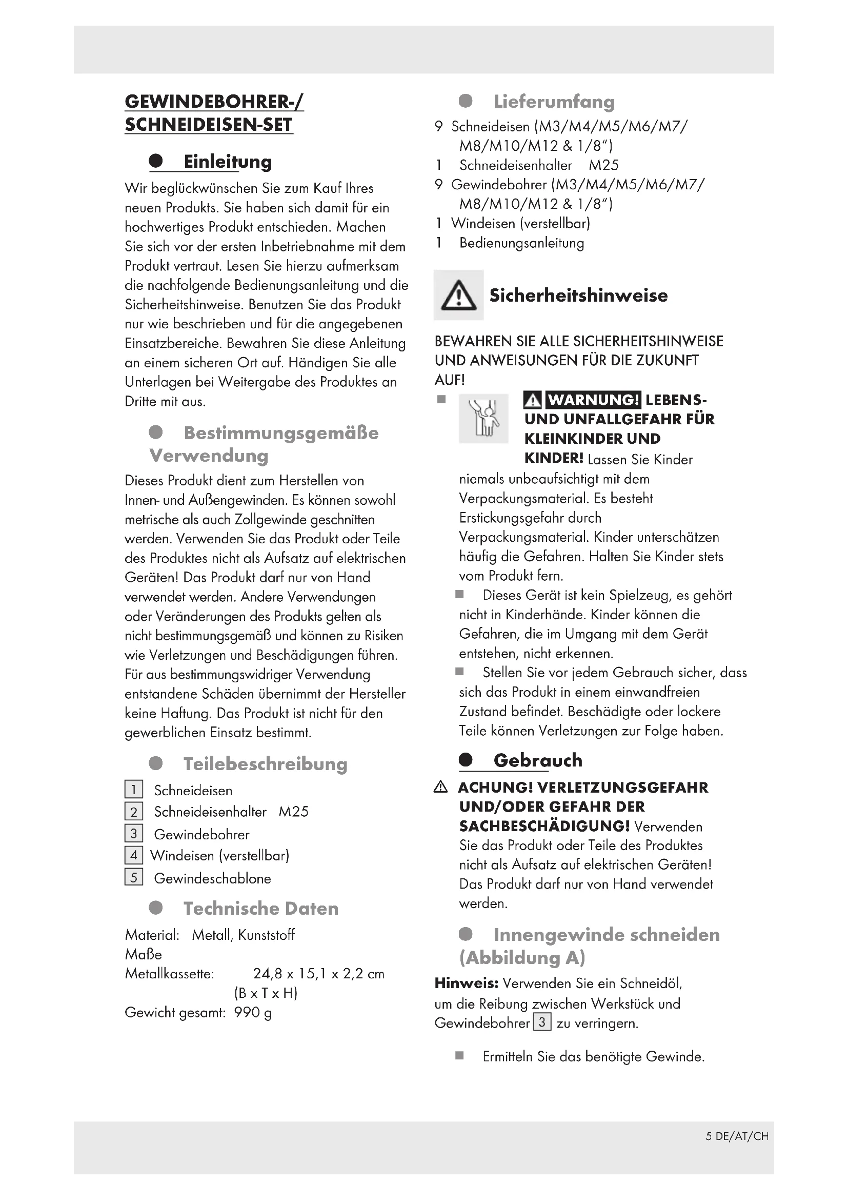 00_321415_OS_Cover.indd 4-6 25/3/2019 1:56 PM5 DE/AT/CH GEWINDEBOHRER-/ SCHNEIDEISEN-SET Einleitung Wir beglückwünschen Sie zum Kauf Ihres neuen Produkts. Sie haben sich damit für ein hochwertiges Produkt entschieden. Machen Sie sich vor der ersten Inbetriebnahme mit dem Produkt vertraut. Lesen Sie hierzu aufmerksam die nachfolgende Bedienungsanleitung und die Sicherheitshinweise. Benutzen Sie das Produkt nur wie beschrieben und für die angegebenen Einsatzbereiche. Bewahren Sie diese Anleitung an einem sicheren Ort auf. Händigen Sie alle Unterlagen bei Weitergabe des Produktes an Dritte mit aus. Bestimmungsgemäße Verwendung Dieses Produkt dient zum Herstellen von Innen- und Außengewinden. Es können sowohl metrische als auch Zollgewinde geschnitten werden. Verwenden Sie das Produkt oder Teile des Produktes nicht als Aufsatz auf elektrischen Geräten! Das Produkt darf nur von Hand verwendet werden. Andere Verwendungen oder Veränderungen des Produkts gelten als nicht bestimmungsgemäß und können zu Risiken wie Verletzungen und Beschädigungen führen. Für aus bestimmungswidriger Verwendung entstandene Schäden übernimmt der Hersteller keine Haftung. Das Produkt ist nicht für den gewerblichen Einsatz bestimmt. Teilebeschreibung