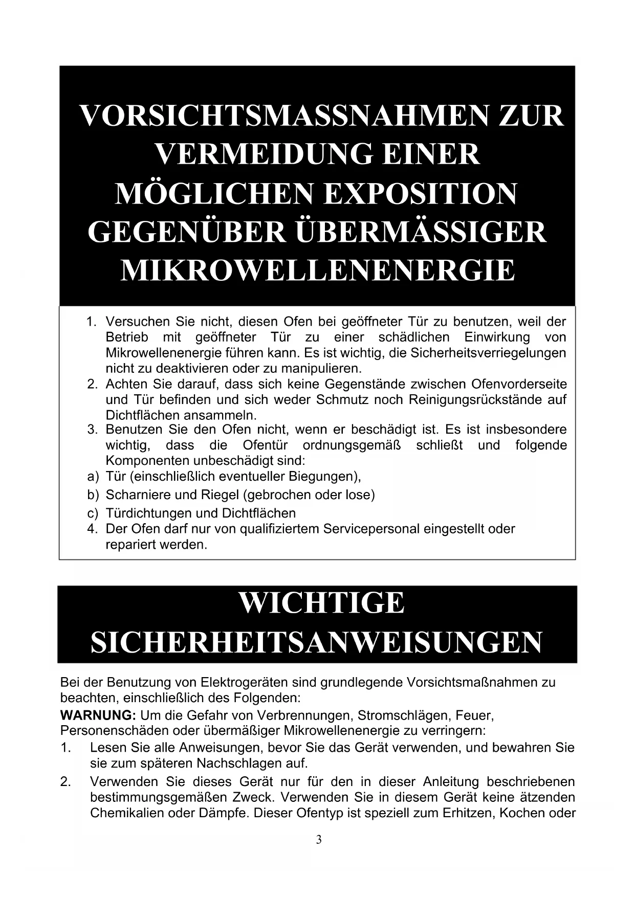 Versuchen Sie nicht, diesen Ofen bei geöffneter Tür zu benutzen, weil der Betrieb mit geöffneter Tür zu einer schädlichen Einwirkung von Mikrowellenenergie führen kann. Es ist wichtig, die Sicherheitsverriegelungen nicht zu deaktivieren oder zu manipulieren.