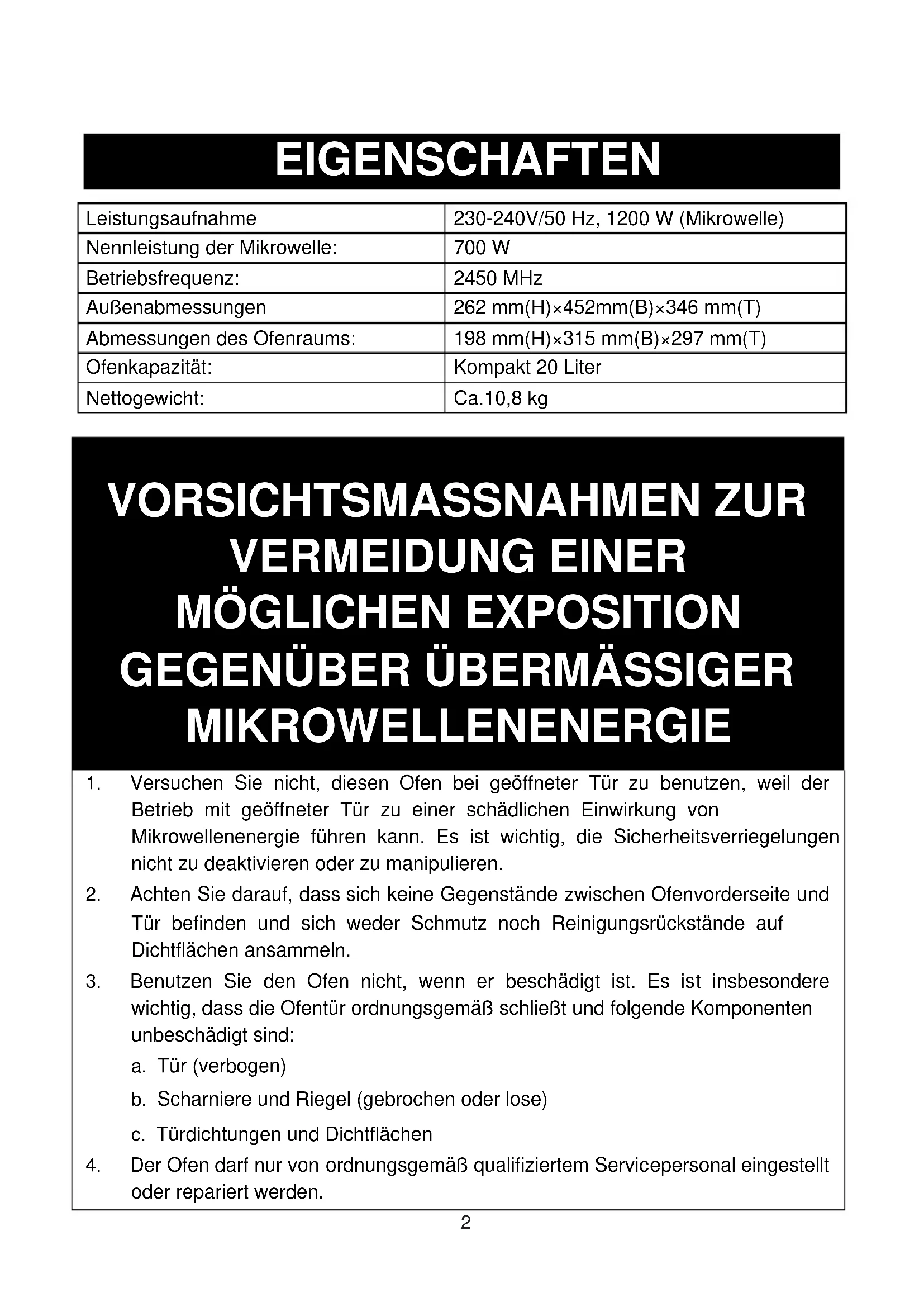 EIGENSCHAFTEN Leistungsaufnahme 230-240V/50 Hz, 1200 W (Mikrowelle) Nennleistung der Mikrowelle: 700 W Betriebsfrequenz: 2450 MHz Außenabmessungen 262 mm(H)×452mm(B)×346 mm(T) Abmessungen des Ofenraums: 198 mm(H)×315 mm(B)×297 mm(T) Ofenkapazität: Kompakt 20 Liter Nettogewicht: Ca.10,8 kg