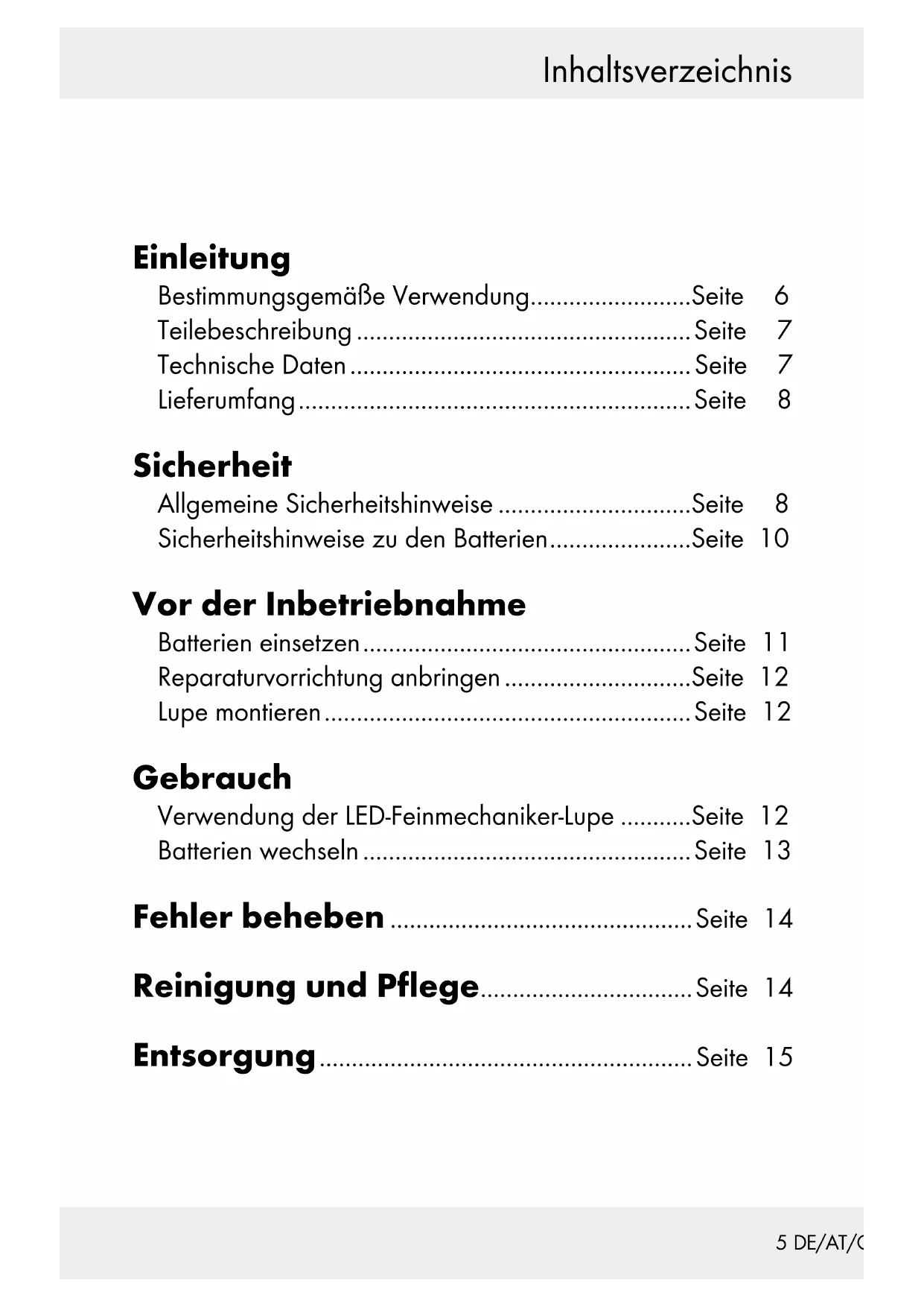 215 DE/AT/CH Inhaltsverzeichnis Einleitung Bestimmungsgemäße Verwendung .........................Seite 6 Teilebeschreibung ....................................................Seite 7 Technische Daten ..................................................... Seite 7 Lieferumfang ............................................................. Seite 8 Sicherheit Allgemeine Sicherheitshinweise ..............................Seite 8 Sicherheitshinweise zu den Batterien ......................Seite 10 Vor der Inbetriebnahme Batterien einsetzen ................................................... Seite 11 Reparaturvorrichtung anbringen .............................Seite 12 Lupe montieren ......................................................... Seite 12 Gebrauch Verwendung der LED-Feinmechaniker-Lupe ...........Seite 12 Batterien wechseln ...................................................Seite 13 Fehler beheben ...............................................Seite 14 Reinigung und Pflege .................................Seite 14 Entsorgung .......................................................... Seite 156 DE/AT/CH Einleitung Feinmechaniker-LED-Lupe Einleitung Die Bedienungsanleitung ist Bestandteil dieses Produkts. Sie enthält wichtige Hinweise für Sicher- heit, Gebrauch und Entsorgung. Machen Sie sich vor der Benutzung des Produkts mit allen Bedien- und Sicher- heitshinweisen vertraut. Benutzen Sie das Produkt nur wie beschrieben und für die angegebenen Einsatzbereiche. Händigen Sie alle Unterlagen bei Weitergabe des Produkts an Dritte mit aus.