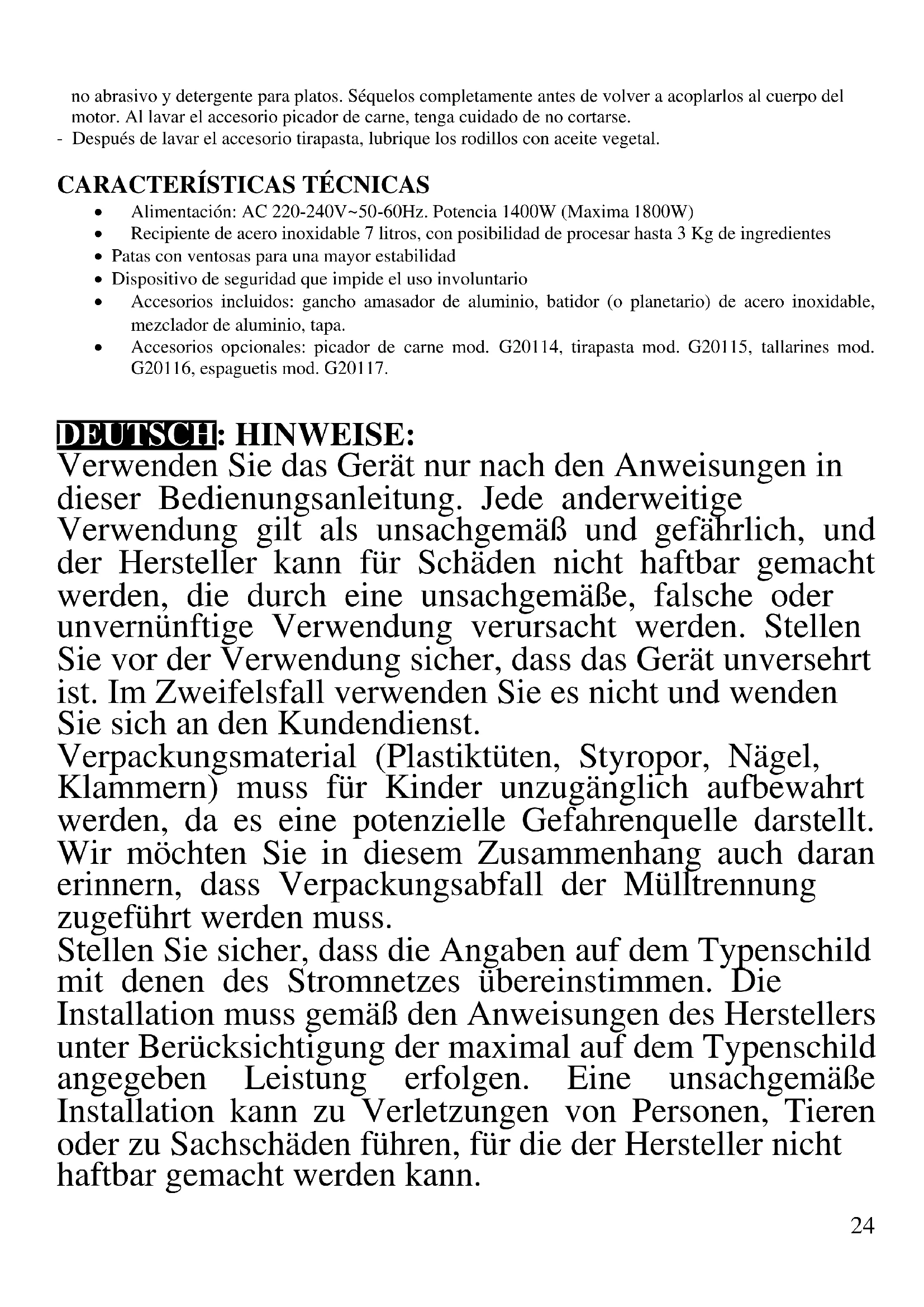ALLGEMEINE INFORMATIONEN - Vor dem ersten Gebrauch sorgfältig alle Teile waschen, die mit Lebensmitteln in Kontakt kommen: Behälter, Abdeckung und Zubehör. - Um eine Überhitzung des Motors zu vermeiden, darf das Gerät nicht länger als 20 Minuten betrieben werden; falls notwendig, arbeiten Sie in Intervallen mit mindestens 10 Minuten Pause. Verwenden Sie das Gerät nie ohne Lebensmittel im Behälter. - Legen Sie Ihre Finger nicht in den Behälter mit Lebensmitteln, während das Gerät in Betrieb ist. Halten Sie Ihre Haare und Kleidung von sich bewegenden Teilen fern.27 - Legen Sie keine Gegenstände oder Zutaten ein, während die Maschine läuft. - Stellen Sie das Gerät auf eine flache, stabile und nicht rutschige Oberfläche. Bringen Sie den Knopf auf "0" (OFF), bevor Sie den Stecker in die Steckdose stecken. - Prüfen Sie vor dem Betrieb, ob die Teile korrekt montiert sind. Montieren Sie, bevor Sie den Stecker einstecken, das richtige Zubehör. - Schalten Sie das Gerät immer aus, bevor Sie das Zubehör entfernen oder wechseln. Reinigen Sie das Zubehör nach jedem Gebrauch. - Lassen Sie das Gerät während des Betriebs niemals unbeaufsichtigt. Tauchen Sie die Haupteinheit nicht in Wasser oder andere Flüssigkeiten ein; reinigen Sie sie mit einem feuchten Tuch. WARNUNG!!! Überladen Sie das Gerät nicht. Das Gesamtgewicht der Zutaten im Behälter darf nicht schwerer sein als 3 kg bei weichem Teig oder 2 kg bei harten Teig, wie Pizzateig oder 1.5 kg bei frisch hergestellten Teigwaren. - Wenn Sie den Teigwarenherstellerzusatz verwenden, halten Sie Finger, Haare und Kleider von den Rollen entfernt. Bei Verwendung des Fleischwolfs darf nur das spezielle Zubehör verwendet werden, um die Lebensmittel ins Innere des Einschubrohres zu drücken. WARNUNG!!! Benutzen Sie das Gerät mit optionalen Zubehör nicht gleichzeitig als Knetmaschine. Dies kann zu einer Beschädigung durch Überlastung führen. BESCHREIBUNG G20149
