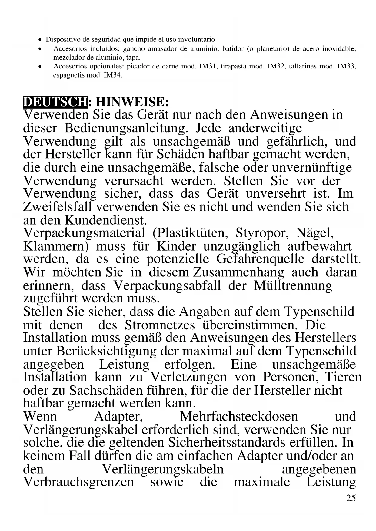 Es sind drei Zubehörteile enthalten, die je nach Situation verwendet werden. HAKEN (6). Verwenden Sie dieses Zubehör mit hartem Teig, wie Brot, Pizza, Pasta, etc... MIXER (7). Verwenden Sie es mit weichen Teig, wie Süßigkeiten, oder zum durchmischen, mixen STAMPFER (8). Verwenden Sie es zum Schlagen von Eiern. PASTA-, FETTUCCINE- und SPAGHETTI-HERSTELLER (optional) Der Teigwarenhersteller, der Fettuccine-Hersteller und der Spaghetti-Hersteller sind nicht im Paket enthalten und werden separat angeboten. Sie können ihn von Ihrem Händler bestellen, indem Sie nach Misty Modell IM32 (Pasta Maker), Modell IM33 (Fettuccine Maker), Modell IM34(Spaghetti Maker) fragen. Montieren Sie die Befestigung am Hauptkörper (4), indem Sie die Abdeckung (10) entfernen, um das Getriebe freizulegen und anzubringen. FLEISCHWOLF (optional) Der Fleischwolf ist nicht im Lieferumfang enthalten und wird separat geliefert. Er kann bei Ihrem Händler bestellt werden, indem Sie nach dem Modell MF31 fragen. 1 Fleischschale 2 Lebensmitteldrücker 3 Fleischwolf 4 Spirale 5 Klinge 6 Dünnschnittscheibe 7 Grobschnittscheibe 8 Mitteschnittscheibe 9 Ringaufsatz Zusammenbau des Gerätes: Setzen Sie die Spirale (4) in den Fleischwolf (3), die Klinge (5) auf die Spirale und eine der Scheiben (6, 7 oder 8) über die Klinge. Wählen Sie die Scheibe je nach Art des Hackergebnisses, den Sie erhalten möchten. Blockieren Sie die Elemente durch Verschrauben des Ringes (9). Bauen Sie die Schale (1) über der Oberseite des Fleischwolfs (3) zusammen. Befestigen Sie am Ende den Fleischwolf an den Hauptkörper (4), indem Sie die Abdeckung (10) entfernen, um das Getriebe zu entnehmen und dem Fleischwolf zuzuordnen. REINIGUNG - Ziehen Sie den Netzstecker. Tauchen Sie den Hauptkörper niemals in Wasser, sondern waschen Sie ihn mit einem feuchten Tuch und einem nicht scheuernden Reinigungsmittel. Vermeiden Sie jedes Eindringen von Wasser ins Motorgehäuse. Die Aufsätze, der Behälter und der Deckel können nicht in der Spülmaschine gewaschen werden, waschen sie sie mit einem nicht scheuerndem Schwamm und mildem Reinigungsmittel mit der Hand. Trocknen Sie sie gründlich, bevor Sie sie an die Einheit montieren. Passen Sie beim Waschen der Fleischwolfklinge auf, damit Sie sich nicht schneiden. Schmieren Sie nach dem Waschen des Nudel-Herstellers die Walzen mit Pflanzenöl ein.30 TECHNISCHE MERKMALE