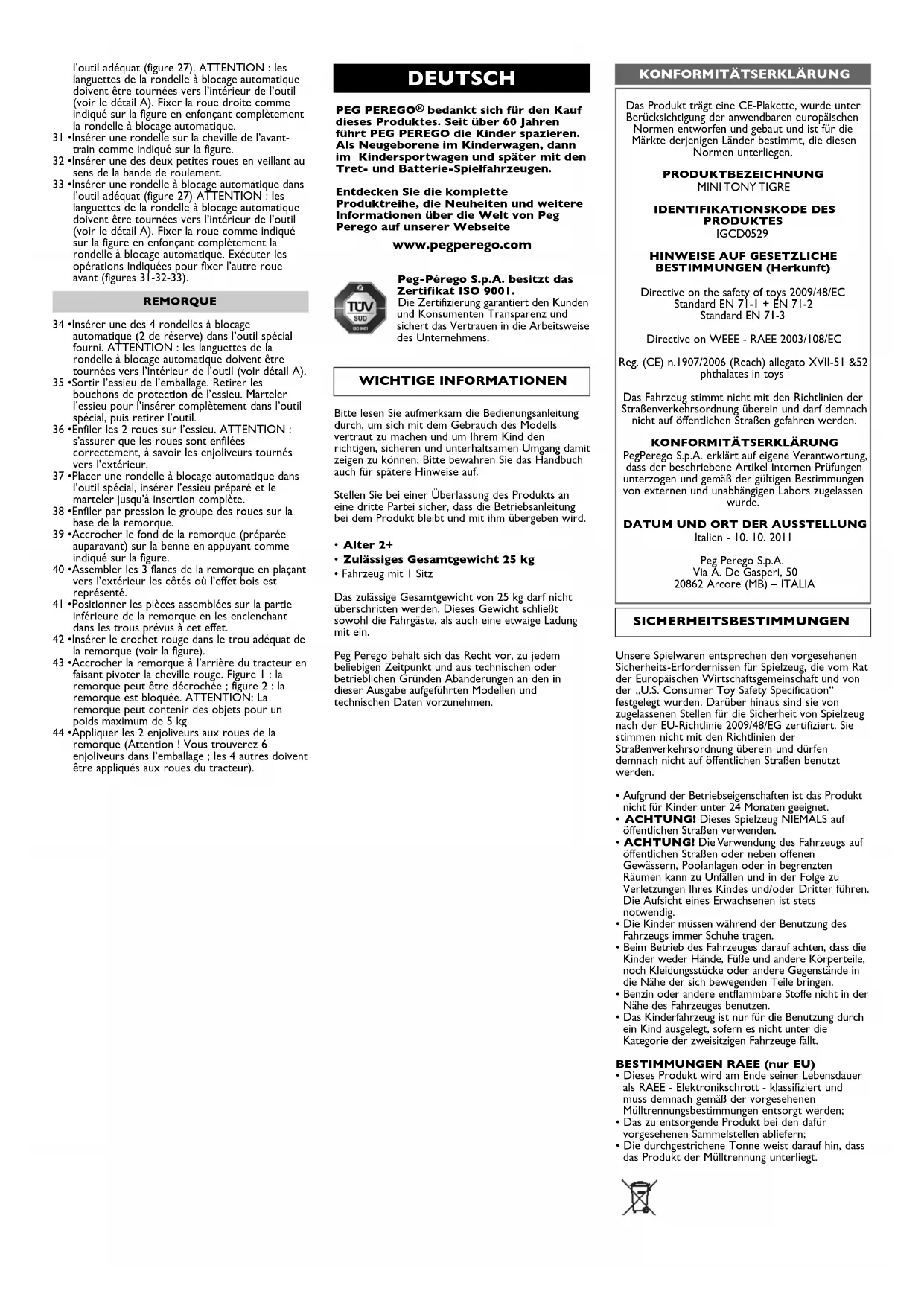 - Fahrzeug mit 1 Sitz Das zulässige Gesamtgewicht von 25 kg darf nicht überschritten werden. Dieses Gewicht schließt sowohl die Fahrgäste, als auch eine etwaige Ladung mit ein. Peg Perego behält sich das Recht vor, zu jedem beliebigen Zeitpunkt und aus technischen oder betrieblichen Gründen Abänderungen an den in dieser Ausgabe aufgeführten Modellen und technischen Daten vorzunehmen. WICHTIGE INFORMATIONEN28 •Das linke Rad laut Abbildung fixieren, indem die Klemm-Unterlegscheibe bis zum Anschlag eingedrückt wird. 29 •Das mitgelieferte konische Werkzeug an der Seite des bereits montierten Rads auf der Achse anordnen. Das Fahrzeug mit dem linken Rad mit dem Werkzeug auf der Unterseite auf eine Seite legen. Darauf achten, dass sich das Werkzeug nicht verschiebt. 30 •Eine Klemm-Unterlegscheibe im Werkzeug anordnen (Abbildung 27). ACHTUNG: die Laschen der Unterlegscheibe müssen zur Innenseite des Werkzeugs hin ausgerichtet sein (siehe Detail A). Das rechte Rad laut Abbildung fixieren, indem die Klemm-Unterlegscheibe bis zum Anschlag ein gedrückt wird. 31 •Eine Unterlegscheibe laut Abbildung auf die Vorderachse aufstecken. 32 •Eines der beiden kleinen Räder aufstecken und darauf achten, dass die Reifenlauffläche richtig ausgerichtet ist. 33 •Eine Klemm-Unterlegscheibe im Werkzeug anordnen (Abbildung 27). ACHTUNG: die Laschen der Unterlegscheibe müssen zur Innenseite des Werkzeugs hin ausgerichtet sein (siehe Detail A). Das Rad laut Abbildung fixieren, indem die Klemm-Unterlegscheibe bis zum Anschlag eingedrückt wird. Die angegebenen Schritte für die Befestigung des zweiten Vorderrads befol gen. (Abbildungen 31-32-33) ANHÄNGER 34 •Eine der 4 Klemm-Unterlegscheiben (2 als Ersatz) ins mitgelieferte Werkzeug einsetzen. ACHTUNG: die Laschen der Unterlegscheibe müssen zur Innenseite des Werkzeugs hin ausgerichtet sein (siehe Detail A). 35 •Die Achse aus der Verpackung nehmen. Die Schutzkappen der Achse abnehmen. Die Achse ganz einsetzen, indem mit einem Hammer aufs Werkzeug gehauen wird; danach das Werkzeug entfernen. 36 •Die 2 Räder auf die Achse schieben. ACHTUNG: sicherstellen, dass die Räder einwandfrei eingesetzt sind, d.h. mit den Radnabenkappen nach außen. 37 •Eine Klemm-Unterlegscheibe im Werkzeug anordnen, die vorbereitete Achse einführen und ganz einhämmern. 38 •Die Radeinheit am Anhängerboden einsetzen. 39 •Den bereits vorbereiteten Anhängerboden durch Eindrücken (siehe Abbildung) an der Pritsche fixieren. 40 •Setzen Sie die drei Seitenteile des Hängers zusammen. Achten Sie dabei darauf, dass die Seiten mit der Holzimitation nach außen zeigen. 41 •Stecken Sie die zusammengesetzten Teile in die dafür vorgesehenen Löcher auf der Ladefläche des Hängers. 42 •Den roten Haken ins Loch am Anhänger stecken (siehe Abbildung). 43 •Den Anhänger an Traktor anhängen und den roten Haken drehen. Abbildung 1: der Anhänger kann abgenommen werden; Abbildung 2: der Anhänger ist befestigt. ACHTUNG: Der Anhänger kann bis zu 5 kg Gewicht tragen. 44 •Die 2 Radnabenkappen an den Rädern des Anhängers anbringen (Achtung - in der Verpackung finden Sie 6 Radnabenkappen; die restlichen 4 sind für die Räder des Traktors).