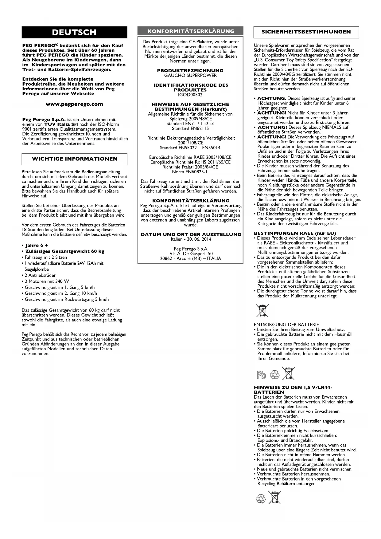 - Geschwindigkeit im Rückwärtsgang 5 km/h Das zulässige Gesamtgewicht von 60 kg darf nicht überschritten werden. Dieses Gewicht schließt sowohl die Fahrgäste, als auch eine etwaige Ladung mit ein. Peg Perego behält sich das Recht vor, zu jedem beliebigen Zeitpunkt und aus technischen oder betrieblichen Gründen Abänderungen an den in dieser Ausgabe aufgeführten Modellen und technischen Daten vorzunehmen. Das Produkt trägt eine CE-Plakette, wurde unter Berücksichtigung der anwendbaren europäischen Normen entworfen und gebaut und ist für die Märkte derjenigen Länder bestimmt, die diesen Normen unterliegen. PRODUKTBEZEICHNUNG GAUCHO SUPERPOWER IDENTIFIKATIONSKODE DES PRODUKTES IGOD00502