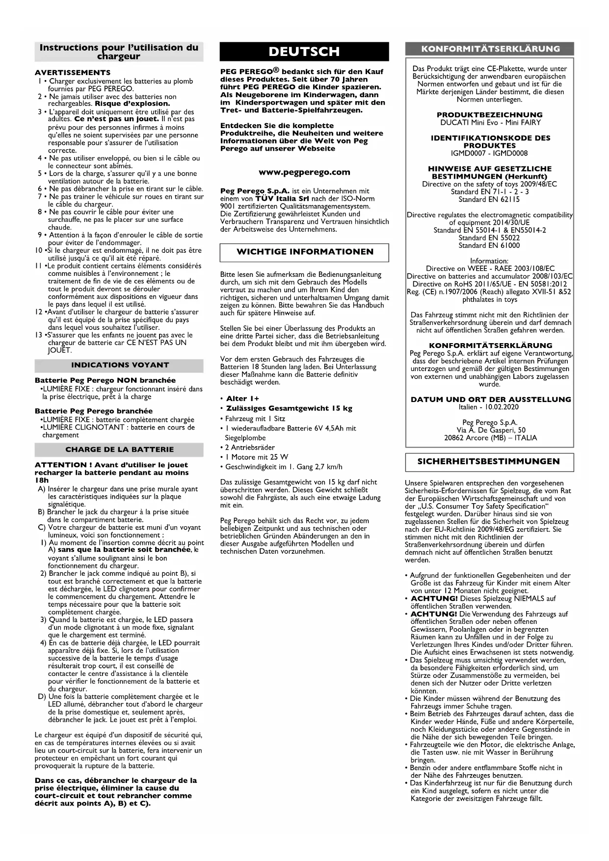 - Geschwindigkeit im 1. Gang 2,7 km/h Das zulässige Gesamtgewicht von 15 kg darf nicht überschritten werden. Dieses Gewicht schließt sowohl die Fahrgäste, als auch eine etwaige Ladung mit ein. Peg Perego behält sich das Recht vor, zu jedem beliebigen Zeitpunkt und aus technischen oder betrieblichen Gründen Abänderungen an den in dieser Ausgabe aufgeführten Modellen und technischen Daten vorzunehmen. Das Produkt trägt eine CE-Plakette, wurde unter Berücksichtigung der anwendbaren europäischen Normen entworfen und gebaut und ist für die Märkte derjenigen Länder bestimmt, die diesen Normen unterliegen. PRODUKTBEZEICHNUNG DUCATI Mini Evo - Mini FAIRY IDENTIFIKATIONSKODE DES PRODUKTES