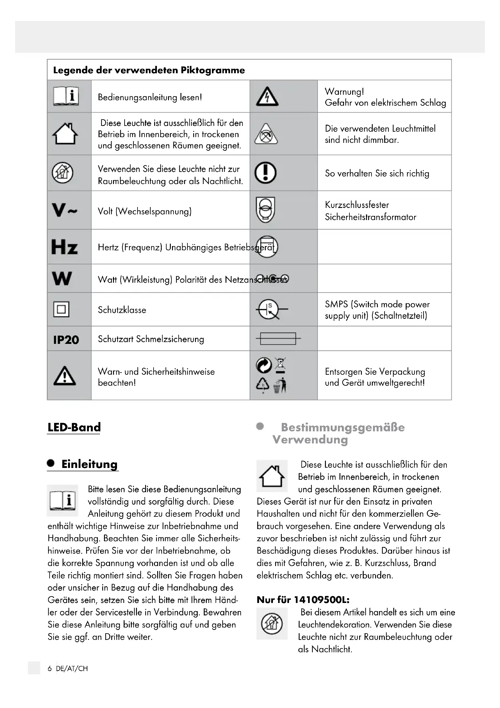 Entsorgen Sie Verpackung und Gerät umweltgerecht! LED-Band Einleitung Bitte lesen Sie diese Bedienungsanleitung vollständig und sorgfältig durch. Diese Anleitung gehört zu diesem Produkt und enthält wichtige Hinweise zur Inbetriebnahme und Handhabung. Beachten Sie immer alle Sicherheits- hinweise. Prüfen Sie vor der Inbetriebnahme, ob die korrekte Spannung vorhanden ist und ob alle Teile richtig montiert sind. Sollten Sie Fragen haben oder unsicher in Bezug auf die Handhabung des Gerätes sein, setzen Sie sich bitte mit Ihrem Händ- ler oder der Servicestelle in Verbindung. Bewahren Sie diese Anleitung bitte sorgfältig auf und geben Sie sie ggf. an Dritte weiter. Bestimmungsgemäße Verwendung Diese Leuchte ist ausschließlich für den Betrieb im Innenbereich, in trockenen und geschlossenen Räumen geeignet. Dieses Gerät ist nur für den Einsatz in privaten Haushalten und nicht für den kommerziellen Ge- brauch vorgesehen. Eine andere Verwendung als zuvor beschrieben ist nicht zulässig und führt zur Beschädigung dieses Produktes. Darüber hinaus ist dies mit Gefahren, wie z. B. Kurzschluss, Brand elektrischem Schlag etc. verbunden. Nur für 14109500L: Bei diesem Artikel handelt es sich um eine Leuchtendekoration. Verwenden Sie diese Leuchte nicht zur Raumbeleuchtung oder als Nachtlicht. Einleitung / SicherheitEinleitung7 DE/AT/CH Lieferumfang Kontrollieren Sie unmittelbar nach dem Auspacken immer den Lieferumfang auf Vollständigkeit sowie den einwandfreien Zustand des Gerätes. 1 LED-Band 2 Verbinder 4 Abschlusskappen 2 Kabelhalterung 1 Klebestreifen 1 Bedienungsanleitung Teilebeschreibung