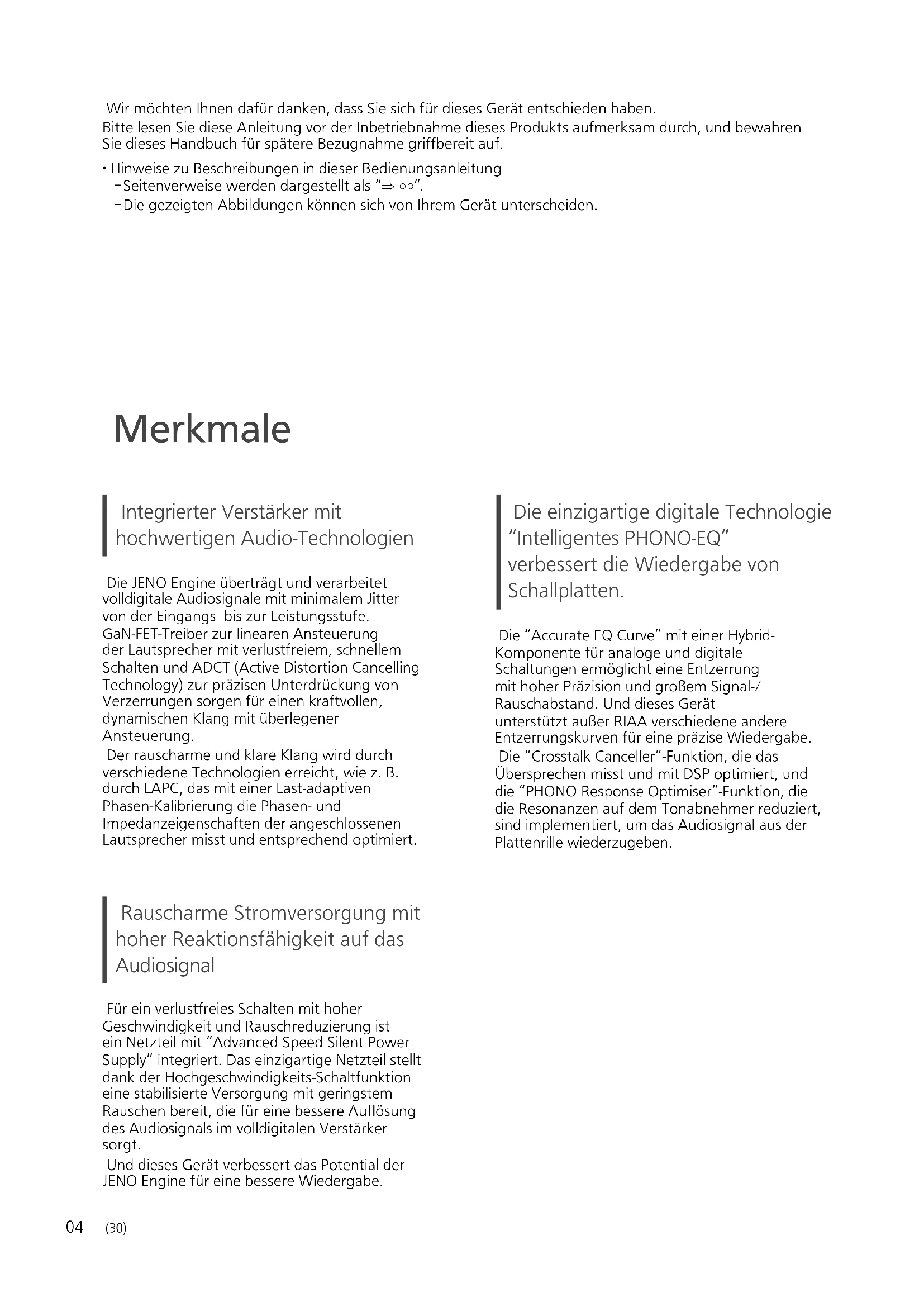 (30) Wir möchten Ihnen dafür danken, dass Sie sich für dieses Gerät entschieden haben. Bitte lesen Sie diese Anleitung vor der Inbetriebnahme dieses Produkts aufmerksam durch, und bewahren Sie dieses Handbuch für spätere Bezugnahme griffbereit auf.