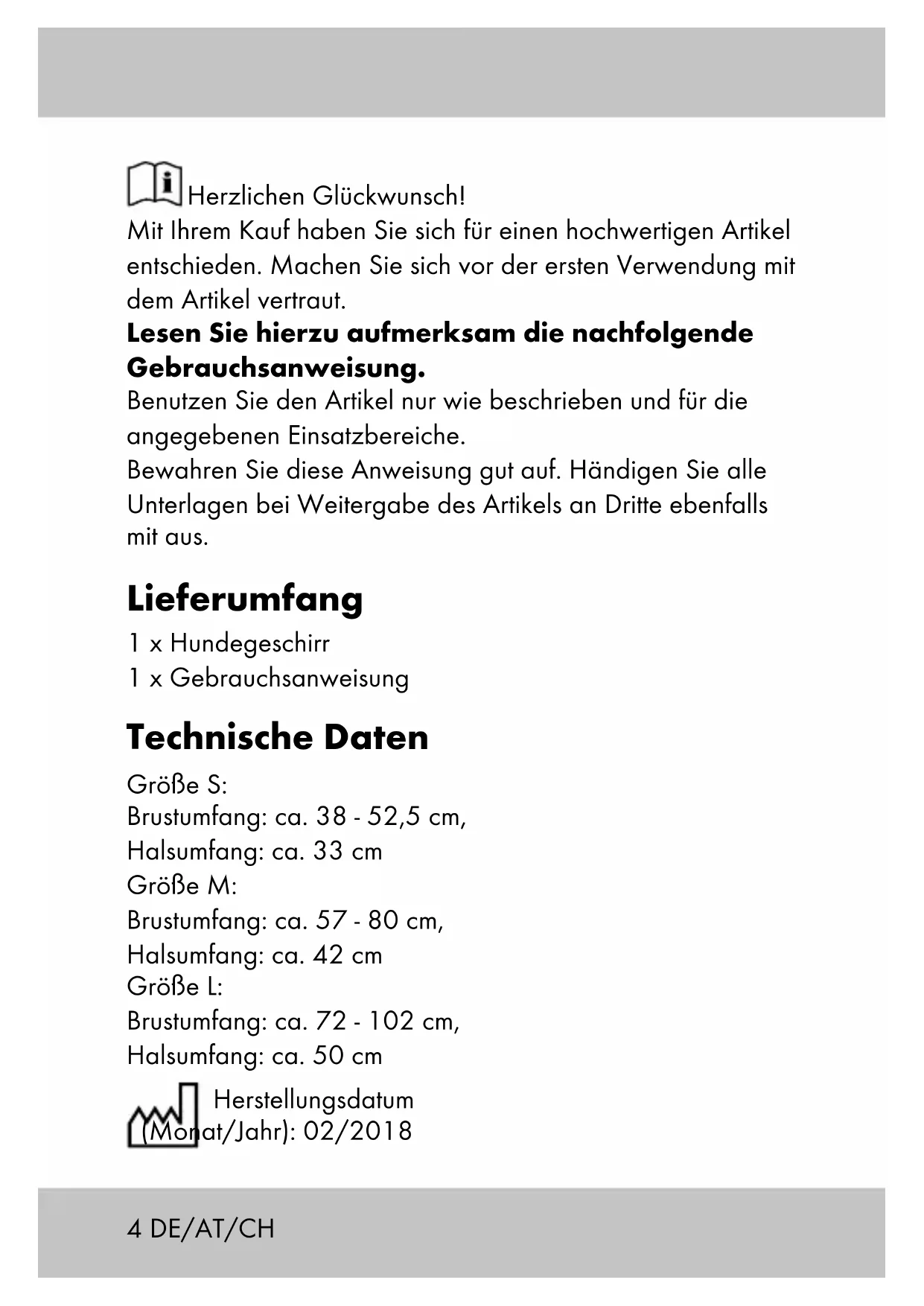 - - 46 Manual de instruções - 534 DE/AT/CH Herzlichen Glückwunsch! Mit Ihrem Kauf haben Sie sich für einen hochwertigen Artikel entschieden. Machen Sie sich vor der ersten Verwendung mit dem Artikel vertraut. Lesen Sie hierzu aufmerksam die nachfolgende Gebrauchsanweisung. Benutzen Sie den Artikel nur wie beschrieben und für die angegebenen Einsatzbereiche. Bewahren Sie diese Anweisung gut auf. Händigen Sie alle Unterlagen bei Weitergabe des Artikels an Dritte ebenfalls mit aus. Lieferumfang 1 x Hundegeschirr 1 x Gebrauchsanweisung Technische Daten Größe S: Brustumfang: ca. 38 - 52,5 cm, Halsumfang: ca. 33 cm Größe M: Brustumfang: ca. 57 - 80 cm, Halsumfang: ca. 42 cm Größe L: Brustumfang: ca. 72 - 102 cm, Halsumfang: ca. 50 cm Herstellungsdatum (Monat/Jahr): 02/20185DE/AT/CH Bestimmungsgemäße Verwendung Dieser Artikel ist als Geschirr für Hunde mit einem Brustum- fang von ca. 38 - 52,5 cm und einem Halsumfang von ca. 33 cm bei Größe S, von ca. 57 - 80 cm Brustumfang und ca. 42 cm Halsumfang bei Größe M und von ca. 72 - 102 cm Brustumfang und ca. 50 cm Halsumfang bei Größe L für den privaten Gebrauch konzipiert. Führen Sie das Geschirr ausschließlich von Hand über die Leine. Der Artikel darf nicht stationär benutzt werden. Sicherheitshinweise Verletzungsgefahr! p. 47