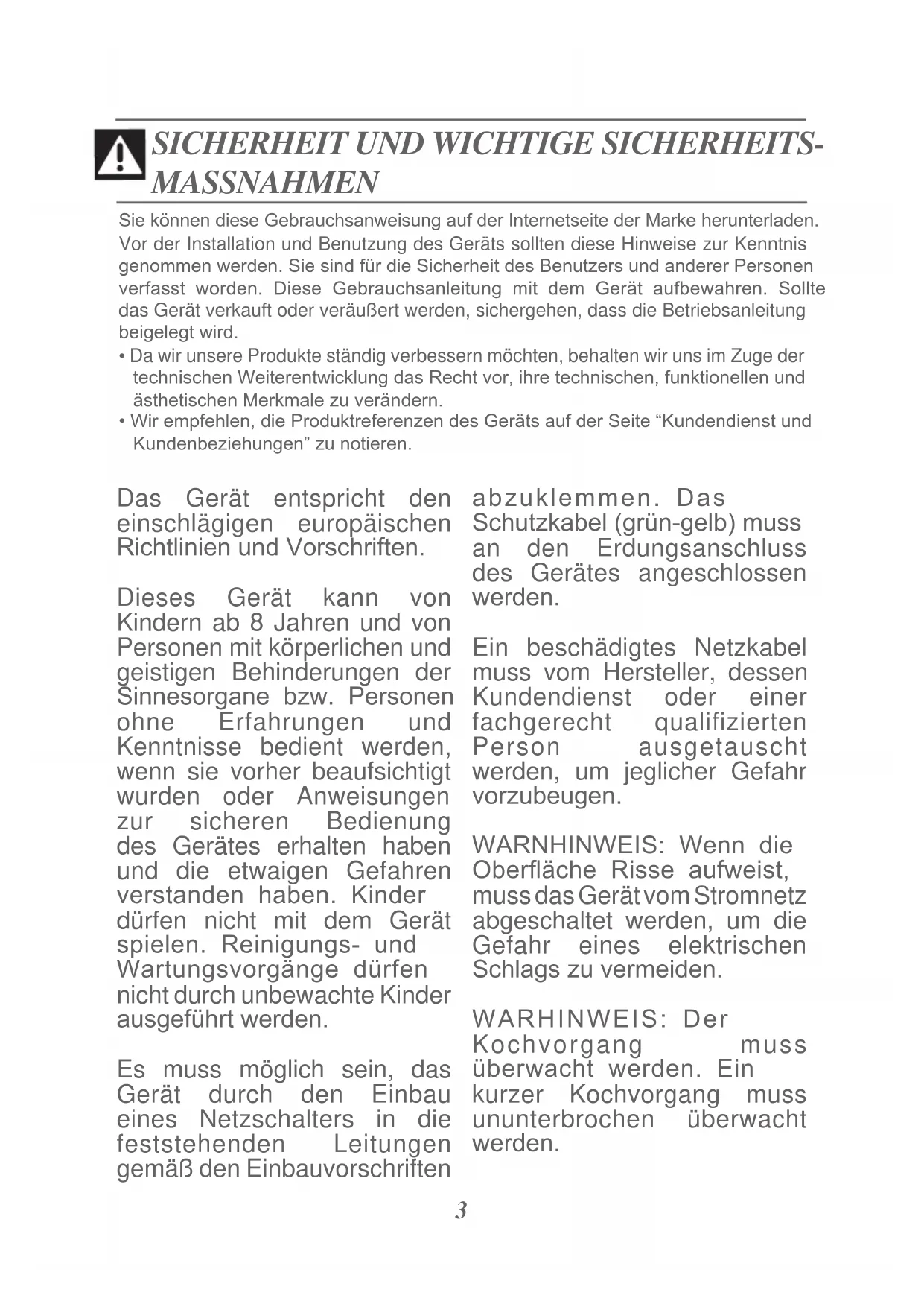 MASSNAHMEN Sie können diese Gebrauchsanweisung auf der Internetseite der Marke herunterladen. Vor der Installation und Benutzung des Geräts sollten diese Hinweise zur Kenntnis genommen werden. Sie sind für die Sicherheit des Benutzers und anderer Personen verfasst worden. Diese Gebrauchsanleitung mit dem Gerät aufbewahren. Sollte das Gerät verkauft oder veräußert werden, sichergehen, dass die Betriebsanleitung beigelegt wird.