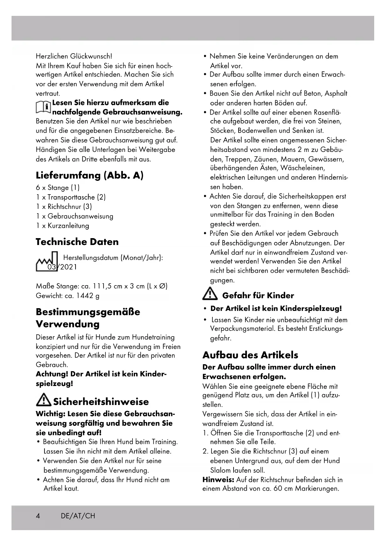 1a34 Herzlichen Glückwunsch! Mit Ihrem Kauf haben Sie sich für einen hoch- wertigen Artikel entschieden. Machen Sie sich vor der ersten Verwendung mit dem Artikel vertraut. Lesen Sie hierzu aufmerksam die nachfolgende Gebrauchsanweisung. Benutzen Sie den Artikel nur wie beschrieben und für die angegebenen Einsatzbereiche. Be- wahren Sie diese Gebrauchsanweisung gut auf. Händigen Sie alle Unterlagen bei Weitergabe des Artikels an Dritte ebenfalls mit aus. Lieferumfang (Abb. A) 6 x Stange (1) 1 x Transporttasche (2) 1 x Richtschnur (3) 1 x Gebrauchsanweisung 1 x Kurzanleitung Technische Daten Herstellungsdatum (Monat/Jahr): 03/2021 Maße Stange: ca. 111,5 cm x 3 cm (L x Ø) Gewicht: ca. 1442 g Bestimmungsgemäße Verwendung Dieser Artikel ist für Hunde zum Hundetraining konzipiert und nur für die Verwendung im Freien vorgesehen. Der Artikel ist nur für den privaten Gebrauch. Achtung! Der Artikel ist kein Kinder- spielzeug! Sicherheitshinweise Wichtig: Lesen Sie diese Gebrauchsan- weisung sorgfältig und bewahren Sie sie unbedingt auf!