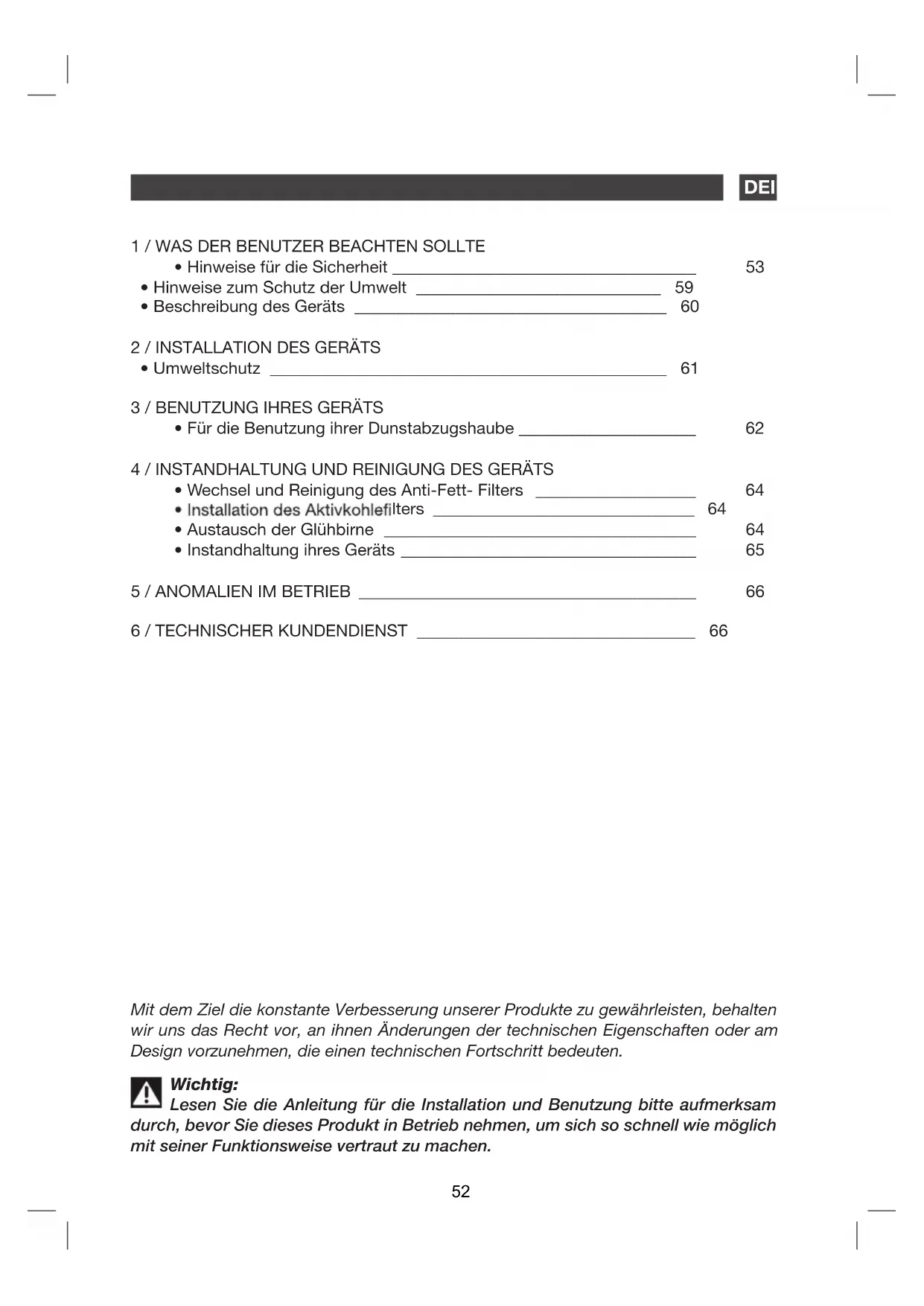 6 / TECHNISCHER KUNDENDIENST _________________________________ 52 Mit dem Ziel die konstante Verbesserung unserer Produkte zu gewährleisten, behalten wir uns das Recht vor, an ihnen Änderungen der technischen Eigenschaften oder am Design vorzunehmen, die einen technischen Fortschritt bedeuten. Wichtig: Lesen Sie die Anleitung für die Installation und Benutzung bitte aufmerksam durch, bevor Sie dieses Produkt in Betrieb nehmen, um sich so schnell wie möglich mit seiner Funktionsweise vertraut zu machen.