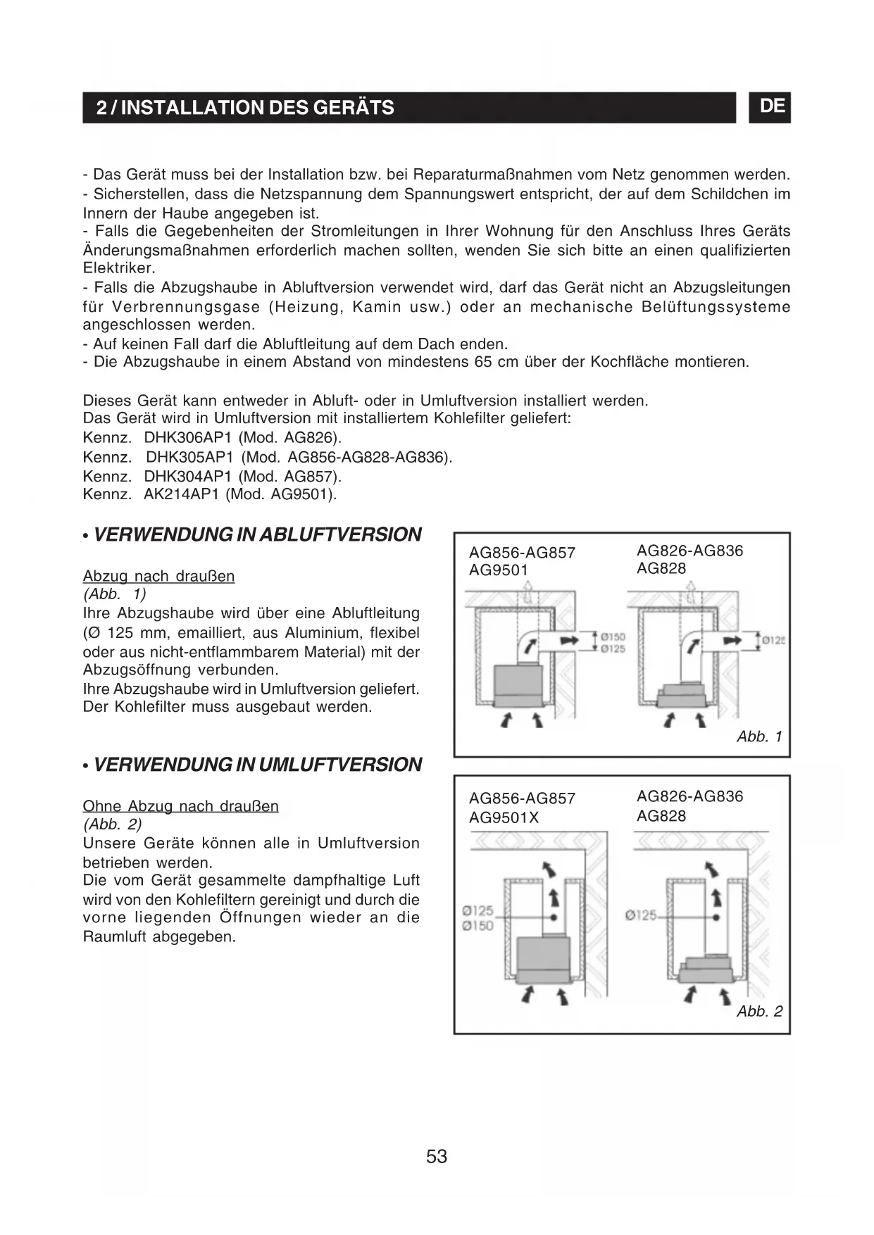 - Das Gerät muss bei der Installation bzw. bei Reparaturmaßnahmen vom Netz genommen werden. - Sicherstellen, dass die Netzspannung dem Spannungswert entspricht, der auf dem Schildchen im Innern der Haube angegeben ist. - Falls die Gegebenheiten der Stromleitungen in Ihrer Wohnung für den Anschluss Ihres Geräts Änderungsmaßnahmen erforderlich machen sollten, wenden Sie sich bitte an einen qualifizierten Elektriker. - Falls die Abzugshaube in Abluftversion verwendet wird, darf das Gerät nicht an Abzugsleitungen für Verbrennungsgase (Heizung, Kamin usw.) oder an mechanische Belüftungssysteme angeschlossen werden. - Auf keinen Fall darf die Abluftleitung auf dem Dach enden. - Die Abzugshaube in einem Abstand von mindestens 65 cm über der Kochfläche montieren. Dieses Gerät kann entweder in Abluft- oder in Umluftversion installiert werden. Das Gerät wird in Umluftversion mit installiertem Kohlefilter geliefert: Kennz. DHK306AP1 (Mod. AG826). Kennz. DHK305AP1 (Mod. AG856-AG828-AG836). Kennz. DHK304AP1 (Mod. AG857). Kennz. AK214AP1 (Mod. AG9501).