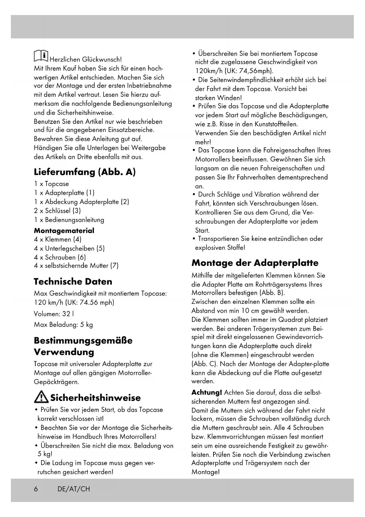 - Transportieren Sie keine entzündlichen oder explosiven Stoffe! Montage der Adapterplatte Mithilfe der mitgelieferten Klemmen können Sie die Adapter Platte am Rohrträgersystems Ihres Motorrollers befestigen (Abb. B). Zwischen den einzelnen Klemmen sollte ein Abstand von min 10 cm gewählt werden. Die Klemmen sollten immer im Quadrat platziert werden. Bei anderen Trägersystemen zum Bei- spiel mit direkt eingelassenen Gewindevorrich- tungen kann die Adapterplatte auch direkt (ohne die Klemmen) eingeschraubt werden (Abb. C). Nach der Montage der Adapter-platte kann die Abdeckung auf die Platte auf-gesetzt werden. Achtung! Achten Sie darauf, dass die selbst- sicherenden Muttern fest angezogen sind. Damit die Muttern sich während der Fahrt nicht lockern, müssen die Schrauben vollständig durch die Muttern geschraubt sein. Alle 4 Schrauben bzw. Klemmvorrichtungen müssen fest montiert sein um eine ausreichende Festigkeit zu gewähr- leisten. Prüfen Sie noch die Verbindung zwischen Adapterplatte und Trägersystem nach der Montage! Herzlichen Glückwunsch! Mit Ihrem Kauf haben Sie sich für einen hoch- wertigen Artikel entschieden. Machen Sie sich vor der Montage und der ersten Inbetriebnahme mit dem Artikel vertraut. Lesen Sie hierzu auf- merksam die nachfolgende Bedienungsanleitung und die Sicherheitshinweise. Benutzen Sie den Artikel nur wie beschrieben und für die angegebenen Einsatzbereiche. Bewahren Sie diese Anleitung gut auf. Händigen Sie alle Unterlagen bei Weitergabe des Artikels an Dritte ebenfalls mit aus. Lieferumfang (Abb. A) 1 x Topcase 1 x Adapterplatte (1) 1 x Abdeckung Adapterplatte (2) 2 x Schlüssel (3) 1 x Bedienungsanleitung Montagematerial 4 x Klemmen (4) 4 x Unterlegscheiben (5) 4 x Schrauben (6) 4 x selbstsichernde Mutter (7) Technische Daten Max Geschwindigkeit mit montiertem Topcase: 120 km/h (UK: 74.56 mph) Volumen: 32 l Max Beladung: 5 kg Bestimmungsgemäße Verwendung Topcase mit universaler Adapterplatte zur Montage auf allen gängigen Motorroller- Gepäckträgern. Sicherheitshinweise