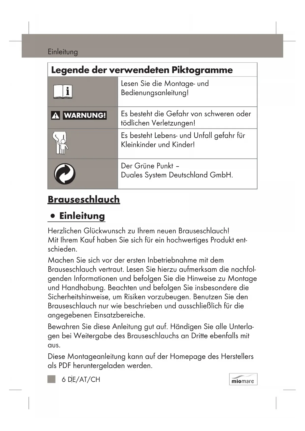 Inhaltsverzeichnis Legende der verwendeten Piktogramme ...........Seite 6 Einleitung ...........................................................................Seite 6 Bestimmungsgemäße Verwendung ..................................Seite 7 Teilebeschreibung ..............................................................Seite 7 Lieferumfang ......................................................................Seite 7 Technische Daten ...............................................................Seite 7 Sicherheitshinweise ....................................................... Seite 8 Montage ............................................................................. Seite 8 Inbetriebnahme ..............................................................Seite 9 Wartung und Reinigung ..............................................Seite 10 Entsorgung ........................................................................Seite 10 Garantie und Service .................................................... Seite 106 DE/AT/CH Einleitung Legende der verwendeten Piktogramme Lesen Sie die Montage- und Bedienungsanleitung! Es besteht die Gefahr von schweren oder tödlichen Verletzungen! Es besteht Lebens- und Unfall gefahr für Kleinkinder und Kinder! Der Grüne Punkt – Duales System Deutschland GmbH. Brauseschlauch