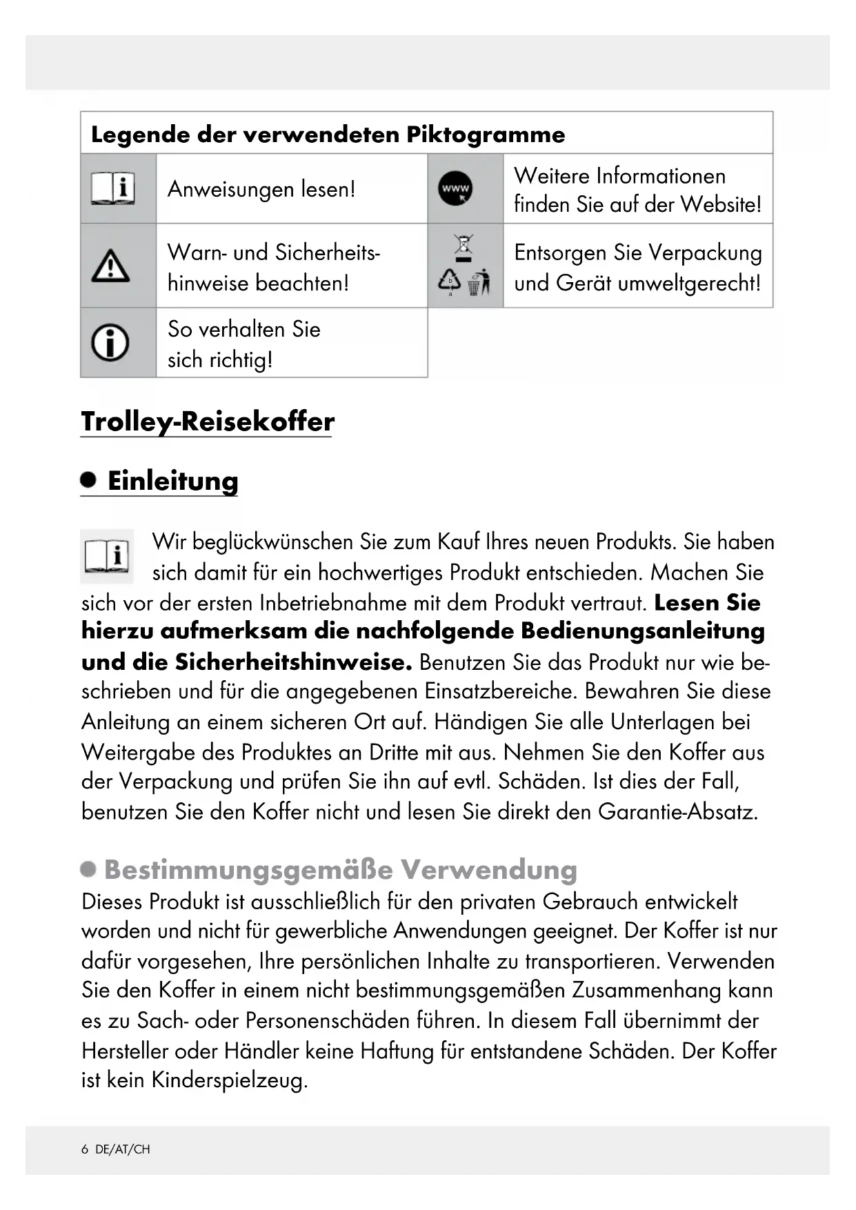 Entsorgen Sie Verpackung und Gerät umweltgerecht! So verhalten Sie sich richtig! Trolley-Reisekoffer Einleitung Wir beglückwünschen Sie zum Kauf Ihres neuen Produkts. Sie haben sich damit für ein hochwertiges Produkt entschieden. Machen Sie sich vor der ersten Inbetriebnahme mit dem Produkt vertraut. Lesen Sie hierzu aufmerksam die nachfolgende Bedienungsanleitung und die Sicherheitshinweise. Benutzen Sie das Produkt nur wie be- schrieben und für die angegebenen Einsatzbereiche. Bewahren Sie diese Anleitung an einem sicheren Ort auf. Händigen Sie alle Unterlagen bei Weitergabe des Produktes an Dritte mit aus. Nehmen Sie den Koffer aus der Verpackung und prüfen Sie ihn auf evtl. Schäden. Ist dies der Fall, benutzen Sie den Koffer nicht und lesen Sie direkt den Garantie-Absatz. Bestimmungsgemäße Verwendung Dieses Produkt ist ausschließlich für den privaten Gebrauch entwickelt worden und nicht für gewerbliche Anwendungen geeignet. Der Koffer ist nur dafür vorgesehen, Ihre persönlichen Inhalte zu transportieren. Verwenden Sie den Koffer in einem nicht bestimmungsgemäßen Zusammenhang kann es zu Sach- oder Personenschäden führen. In diesem Fall übernimmt der Hersteller oder Händler keine Haftung für entstandene Schäden. Der Koffer ist kein Kinderspielzeug.7 DE/AT/CH Teilebeschreibung