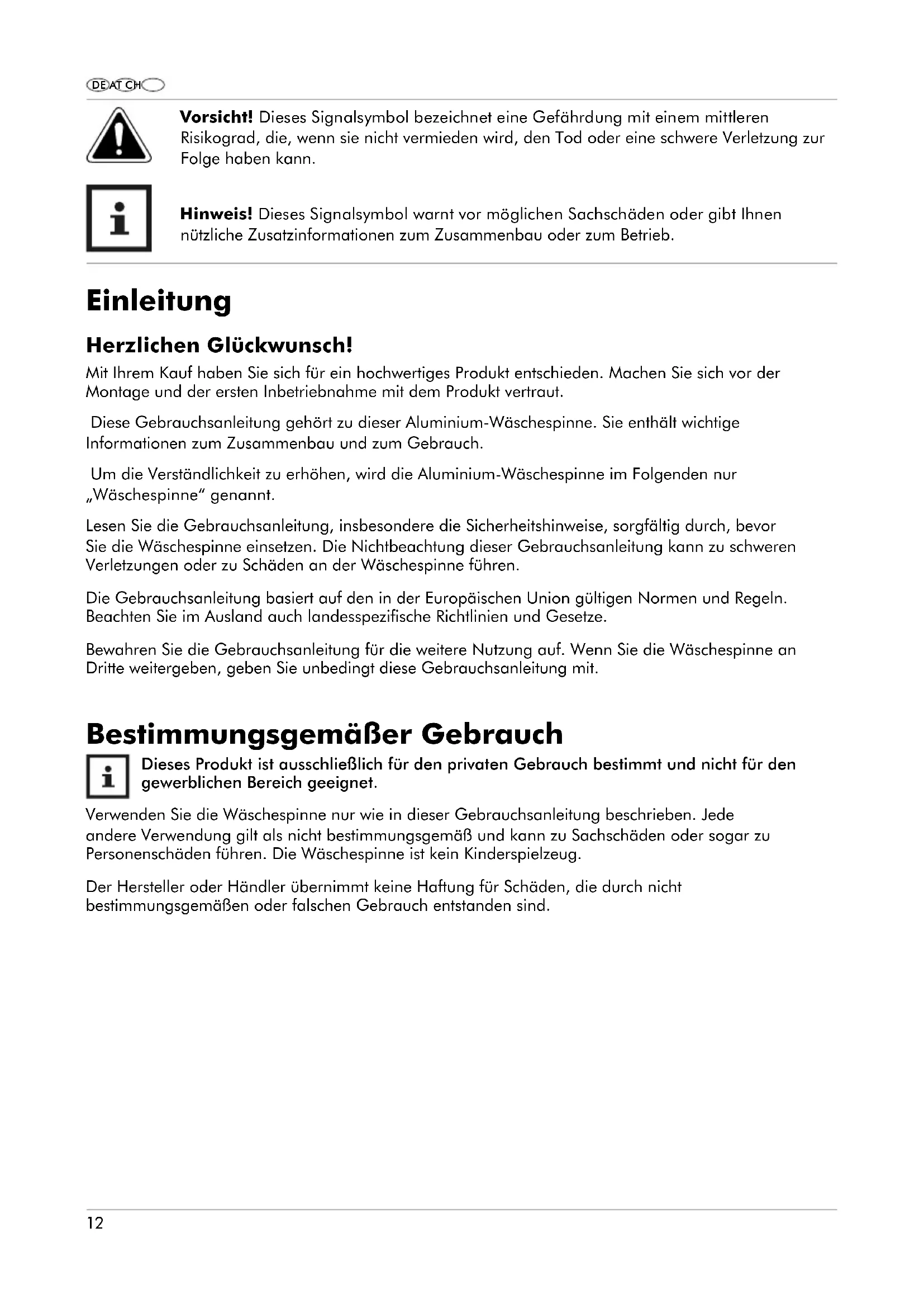 Dieses Produkt ist ausschließlich für den privaten Gebrauch bestimmt und nicht für den gewerblichen Bereich geeignet. Verwenden Sie die Wäschespinne nur wie in dieser Gebrauchsanleitung beschrieben. Jede andere Verwendung gilt als nicht bestimmungsgemäß und kann zu Sachschäden oder sogar zu Personenschäden führen. Die Wäschespinne ist kein Kinderspielzeug. Der Hersteller oder Händler übernimmt keine Haftung für Schäden, die durch nicht bestimmungsgemäßen oder falschen Gebrauch entstanden sind. DE AT CH13 DE aT CH Wäschespinne und Lieferumfang prüfen