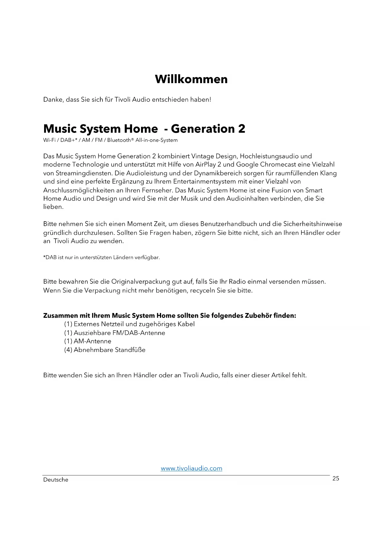 Music System Home - Generation 2 Wi-Fi / DAB+* / AM / FM / Bluetooth® All-in-one-System Das Music System Home Generation 2 kombiniert Vintage Design, Hochleistungsaudio und moderne Technologie und unterstützt mit Hilfe von AirPlay 2 und Google Chromecast eine Vielzahl von Streamingdiensten. Die Audioleistung und der Dynamikbereich sorgen für raumfüllenden Klang und sind eine perfekte Ergänzung zu Ihrem Entertainmentsystem mit einer Vielzahl von Anschlussmöglichkeiten an Ihren Fernseher. Das Music System Home ist eine Fusion von Smart Home Audio und Design und wird Sie mit der Musik und den Audioinhalten verbinden, die Sie lieben. Bitte nehmen Sie sich einen Moment Zeit, um dieses Benutzerhandbuch und die Sicherheitshinweise gründlich durchzulesen. Sollten Sie Fragen haben, zögern Sie bitte nicht, sich an Ihren Händler oder an Tivoli Audio zu wenden. *DAB ist nur in unterstützten Ländern verfügbar.