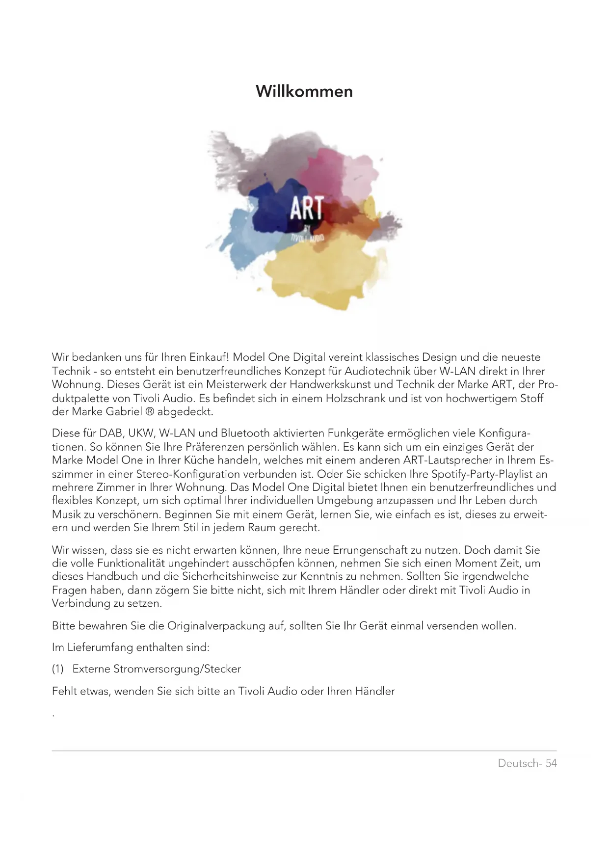 - Häufig gestellte Fragen und Antworten Deutsch- 54 Willkommen Wir bedanken uns für Ihren Einkauf! Model One Digital vereint klassisches Design und die neueste Technik - so entsteht ein benutzerfreundliches Konzept für Audiotechnik über W-LAN direkt in Ihrer Wohnung. Dieses Gerät ist ein Meisterwerk der Handwerkskunst und Technik der Marke ART, der Pro- duktpalette von Tivoli Audio. Es befindet sich in einem Holzschrank und ist von hochwertigem Stoff der Marke Gabriel ® abgedeckt. Diese für DAB, UKW, W-LAN und Bluetooth aktivierten Funkgeräte ermöglichen viele Konfigura- tionen. So können Sie Ihre Präferenzen persönlich wählen. Es kann sich um ein einziges Gerät der Marke Model One in Ihrer Küche handeln, welches mit einem anderen ART-Lautsprecher in Ihrem Es- szimmer in einer Stereo-Konfiguration verbunden ist. Oder Sie schicken Ihre Spotify-Party-Playlist an mehrere Zimmer in Ihrer Wohnung. Das Model One Digital bietet Ihnen ein benutzerfreundliches und flexibles Konzept, um sich optimal Ihrer individuellen Umgebung anzupassen und Ihr Leben durch Musik zu verschönern. Beginnen Sie mit einem Gerät, lernen Sie, wie einfach es ist, dieses zu erweit- ern und werden Sie Ihrem Stil in jedem Raum gerecht. Wir wissen, dass sie es nicht erwarten können, Ihre neue Errungenschaft zu nutzen. Doch damit Sie die volle Funktionalität ungehindert ausschöpfen können, nehmen Sie sich einen Moment Zeit, um dieses Handbuch und die Sicherheitshinweise zur Kenntnis zu nehmen. Sollten Sie irgendwelche Fragen haben, dann zögern Sie bitte nicht, sich mit Ihrem Händler oder direkt mit Tivoli Audio in Verbindung zu setzen. Bitte bewahren Sie die Originalverpackung auf, sollten Sie Ihr Gerät einmal versenden wollen. Im Lieferumfang enthalten sind: (1) Externe Stromversorgung/Stecker Fehlt etwas, wenden Sie sich bitte an Tivoli Audio oder Ihren Händler .Deutsch- 55 Feature-Anleitung Oben Tivoli Audio LOGO: Dies ist ein berührungsempfindliches Bedienelement unter dem Holz. Im WLAN-Modus wird damit die Musikwiedergabe pausiert bzw. gestartet. Im Bluetooth-Modus wird damit der Lautsprecher stummgeschaltet. Bodenplatte A. EIN-/AUSTASTE: Drücken Sie diese Taste, um das Gerät einzuschalten. Halten Sie sie gedrückt, um es auszuschalten. B. SETUP (EINRICHTEN): Drücken Sie diese Taste, damit der Lautsprecher mit Ihrem Heimnetzwerk verbunden werden kann. C. ADD/DROP (HINZUFÜGEN/ENTFERNEN): Wenn der Lautsprecher mit einer Gruppe verbund- en ist, wird er durch Drücken und Halten dieser Taste wieder aus der Gruppe entfernt. Wenn der Lautsprecher nicht mit einer Gruppe verbunden ist, wird dieser durch Drücken der Taste mit der nächsten verfügbaren Gruppe verbunden. Weitere Informationen finden Sie im Abschnitt zur Taste „Add/Drop“ (Hinzufügen/Entfernen) dieses Handbuchs. Feature-Anleitung H I J A B C D E F GDeutsch- 56 D. PARTY MODE (PARTY-MODUS): Halten Sie diese Taste gedrückt, um die Musik von diesem Laut- sprecher auf alle anderen verbundenen Lautsprecher zu übertragen. Weitere Informationen finden Sie im Abschnitt zur Taste „Party Mode“ (Party-Modus) dieses Benutzerhandbuchs. E. SOURCE (QUELLE): Tippen Sie auf diese Taste, um zwischen den Audioquellen zu wechseln. Die Audioquelle wird durch die Farbe der LED angezeigt. Wenn sich das Gerät im Bluetooth-Modus befindet und die LED bereits blinkt, halten Sie diese Taste eine Sekunde lang gedrückt, um den Kopplungsmodus zu aktivieren. Leuchtet die LED durchgehend, halten Sie die Taste so lange gedrückt, bis die LED zu blinken beginnt. LED in Grün – WLAN-Modus LED in Blau – Bluetooth-Streaming-Modus LED in Violett – AUX-Modus F. LAUTSTÄRKE -: Drücken Sie diese Taste, um die Lautstärke zu verringern. G. LAUTSTÄRKE +: Drücken Sie diese Taste, um die Lautstärke zu erhöhen. H. Gleichstromversorgung: Schließen Sie Ihren Tivoli Netzadapter an, um den Akku aufzuladen oder Ihre Lautsprecher mit Strom zu versorgen. Verwenden Sie ausschließlich das mit diesem Pro- dukt gelieferte Netzteil. p. 76