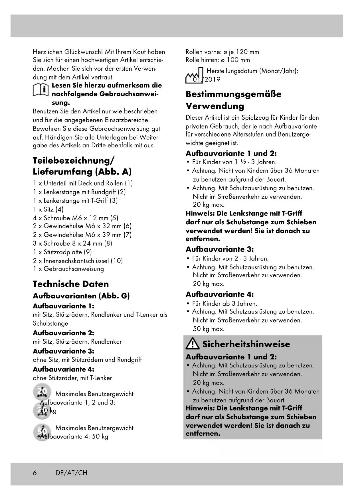 - Notes on the guarantee and service handling - 226 Herzlichen Glückwunsch! Mit Ihrem Kauf haben Sie sich für einen hochwertigen Artikel entschie- den. Machen Sie sich vor der ersten Verwen- dung mit dem Artikel vertraut. Lesen Sie hierzu aufmerksam die nachfolgende Gebrauchsanwei- sung. Benutzen Sie den Artikel nur wie beschrieben und für die angegebenen Einsatzbereiche. Bewahren Sie diese Gebrauchsanweisung gut auf. Händigen Sie alle Unterlagen bei Weiter- gabe des Artikels an Dritte ebenfalls mit aus. Teilebezeichnung/ Lieferumfang (Abb. A) 1 x Unterteil mit Deck und Rollen (1) 1 x Lenkerstange mit Rundgriff (2) 1 x Lenkerstange mit T-Griff (3) 1 x Sitz (4) 4 x Schraube M6 x 12 mm (5) 2 x Gewindehülse M6 x 32 mm (6) 2 x Gewindehülse M6 x 39 mm (7) 3 x Schraube 8 x 24 mm (8) 1 x Stützradplatte (9) 2 x Innensechskantschlüssel (10) 1 x Gebrauchsanweisung Technische Daten Aufbauvarianten (Abb. G) Aufbauvariante 1: mit Sitz, Stützrädern, Rundlenker und T-Lenker als Schubstange Aufbauvariante 2: mit Sitz, Stützrädern, Rundlenker Aufbauvariante 3: ohne Sitz, mit Stützrädern und Rundgriff Aufbauvariante 4: ohne Stützräder, mit T-Lenker Maximales Benutzergewicht Aufbauvariante 1, 2 und 3: 20 kg Maximales Benutzergewicht Aufbauvariante 4: 50 kg Rollen vorne: ø je 120 mm Rolle hinten: ø 100 mm Herstellungsdatum (Monat/Jahr): 01/2019 Bestimmungsgemäße Verwendung Dieser Artikel ist ein Spielzeug für Kinder für den privaten Gebrauch, der je nach Aufbauvariante für verschiedene Altersstufen und Benutzerge- wichte geeignet ist. Aufbauvariante 1 und 2: p. 21