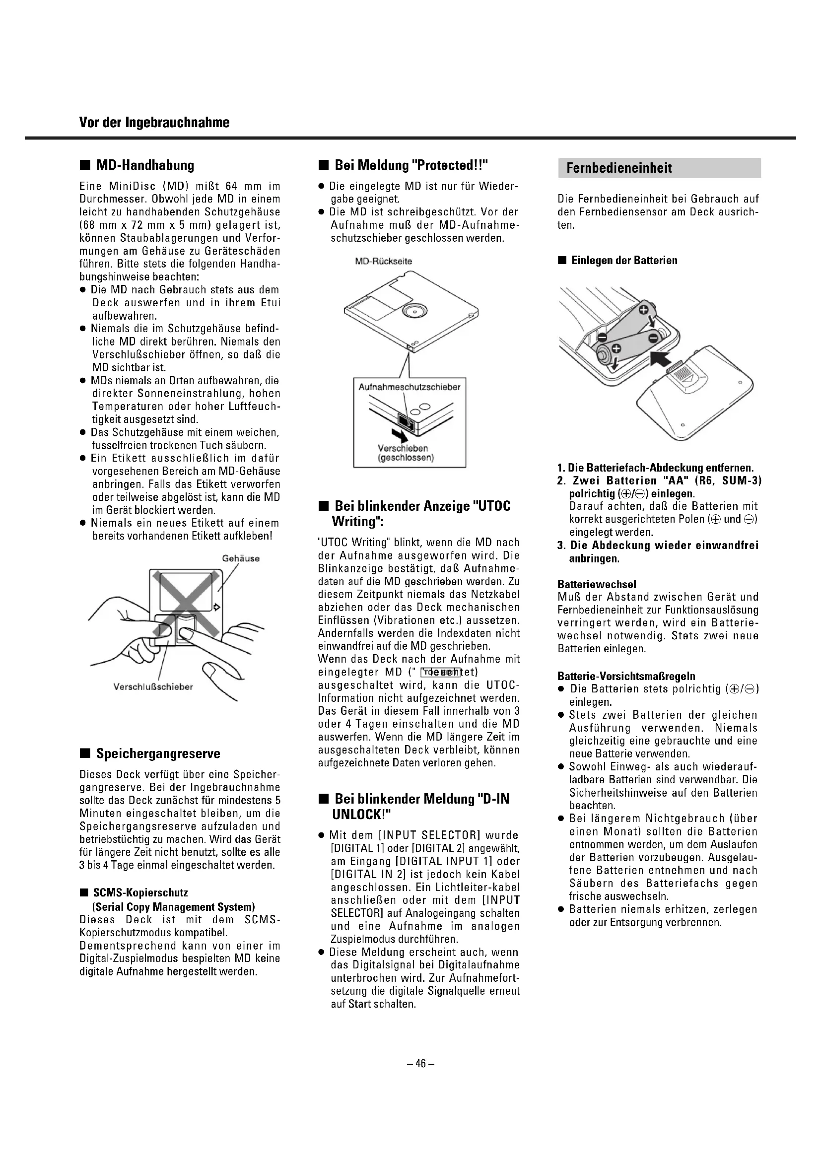 - Technische Daten … Das Gerät auf einer festen, ebenen und nicht geneigten Fläche aufstellen. … Das Gerät nicht direkter Sonnenein- strahlung oder hoher Temperatur- einwirkung aussetzen. Zudem Aufstel- lungsorte vermeiden, die Vibrationen, hoher Staubeinwirkung, extremen Temperaturen oder hoher Luftfeuchtig- keit ausgesetzt sind. … Niemals das Gehäuse öffnen. Andern- falls können eingebaute Schaltkreise beschädigt werden und es besteht Stromschlaggefahr. … Das Gehäuse nicht mit chemischen Lösungsmitteln reinigen. Andernfalls können Verfärbungen und/oder Verfor- mungen auftreten. Ein sauberes trocke- nes fusselfreies Tuch verwenden. … Das Netzkabel beim Abziehen oder Anbringen stets am Netzstecker halten. Niemals am Kabel ziehen. … Bewahren Sie diese Anleitung zur späteren Bezugnahme gut auf. Vor der Ingebrauchnahme durchlesen DEUTSCH– 46 – ª MD-Handhabung Eine MiniDisc (MD) mißt 64 mm im Durchmesser. Obwohl jede MD in einem leicht zu handhabenden Schutzgehäuse (68 mm x 72 mm x 5 mm) gelagert ist, können Staubablagerungen und Verfor- mungen am Gehäuse zu Geräteschäden führen. Bitte stets die folgenden Handha- bungshinweise beachten: … Die MD nach Gebrauch stets aus dem Deck auswerfen und in ihrem Etui aufbewahren. … Niemals die im Schutzgehäuse befind- liche MD direkt berühren. Niemals den Verschlußschieber öffnen, so daß die MD sichtbar ist. … MDs niemals an Orten aufbewahren, die direkter Sonneneinstrahlung, hohen Temperaturen oder hoher Luftfeuch- tigkeit ausgesetzt sind. … Das Schutzgehäuse mit einem weichen, fusselfreien trockenen Tuch säubern. … Ein Etikett ausschließlich im dafür vorgesehenen Bereich am MD-Gehäuse anbringen. Falls das Etikett verworfen oder teilweise abgelöst ist, kann die MD im Gerät blockiert werden. … Niemals ein neues Etikett auf einem bereits vorhandenen Etikett aufkleben! ª Speichergangreserve Dieses Deck verfügt über eine Speicher- gangreserve. Bei der Ingebrauchnahme sollte das Deck zunächst für mindestens 5 Minuten eingeschaltet bleiben, um die Speichergangsreserve aufzuladen und betriebstüchtig zu machen. Wird das Gerät für längere Zeit nicht benutzt, sollte es alle 3 bis 4 Tage einmal eingeschaltet werden. ª SCMS-Kopierschutz (Serial Copy Management System) Dieses Deck ist mit dem SCMS- Kopierschutzmodus kompatibel. Dementsprechend kann von einer im Digital-Zuspielmodus bespielten MD keine digitale Aufnahme hergestellt werden. ª Bei Meldung "Protected!!" … Die eingelegte MD ist nur für Wieder- gabe geeignet. … Die MD ist schreibgeschützt. Vor der Aufnahme muß der MD-Aufnahme- schutzschieber geschlossen werden. ª Bei blinkender Anzeige "UTOC Writing": "UTOC Writing" blinkt, wenn die MD nach der Aufnahme ausgeworfen wird. Die Blinkanzeige bestätigt, daß Aufnahme- daten auf die MD geschrieben werden. Zu diesem Zeitpunkt niemals das Netzkabel abziehen oder das Deck mechanischen Einflüssen (Vibrationen etc.) aussetzen. Andernfalls werden die Indexdaten nicht einwandfrei auf die MD geschrieben. Wenn das Deck nach der Aufnahme mit eingelegter MD (" " leuchtet) ausgeschaltet wird, kann die UTOC- Information nicht aufgezeichnet werden. Das Gerät in diesem Fall innerhalb von 3 oder 4 Tagen einschalten und die MD auswerfen. Wenn die MD längere Zeit im ausgeschalteten Deck verbleibt, können aufgezeichnete Daten verloren gehen. ª Bei blinkender Meldung "D-IN UNLOCK!" … Mit dem [INPUT SELECTOR] wurde [DIGITAL 1] oder [DIGITAL 2] angewählt, am Eingang [DIGITAL INPUT 1] oder [DIGITAL IN 2] ist jedoch kein Kabel angeschlossen. Ein Lichtleiter-kabel anschließen oder mit dem [INPUT SELECTOR] auf Analogeingang schalten und eine Aufnahme im analogen Zuspielmodus durchführen. … Diese Meldung erscheint auch, wenn das Digitalsignal bei Digitalaufnahme unterbrochen wird. Zur Aufnahmefort- setzung die digitale Signalquelle erneut auf Start schalten. Die Fernbedieneinheit bei Gebrauch auf den Fernbediensensor am Deck ausrich- ten. ª Einlegen der Batterien p. 65