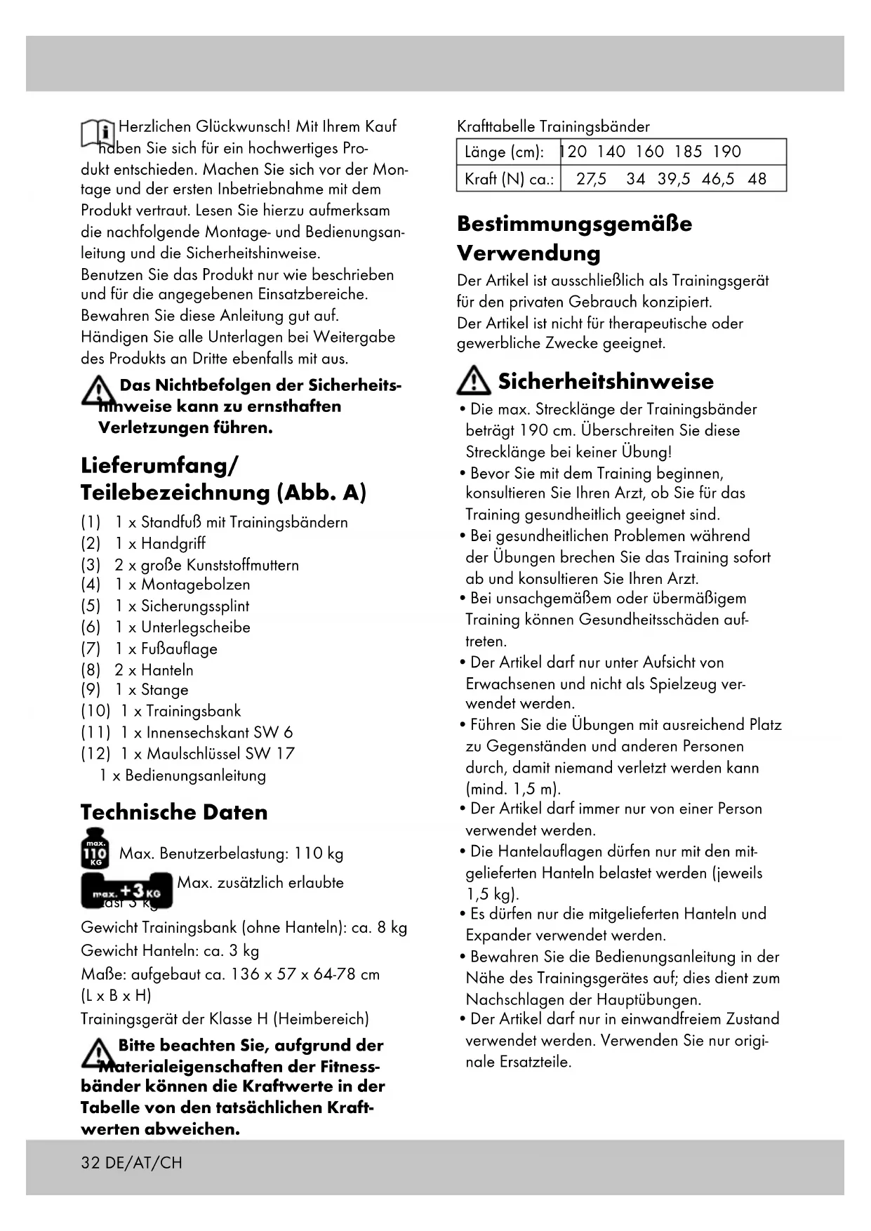 Max. Benutzerbelastung: 110 kg Max. zusätzlich erlaubte Last 3 kg! Gewicht Trainingsbank (ohne Hanteln): ca. 8 kg Gewicht Hanteln: ca. 3 kg Maße: aufgebaut ca. 136 x 57 x 64-78 cm (L x B x H) Trainingsgerät der Klasse H (Heimbereich) Bitte beachten Sie, aufgrund der Materialeigenschaften der Fitness- bänder können die Kraftwerte in der Tabelle von den tatsächlichen Kraft- werten abweichen. Krafttabelle Trainingsbänder Länge (cm): 120 140 160 185 190 Kraft (N) ca.: 27,5 34 39,5 46,5 48 Bestimmungsgemäße Verwendung Der Artikel ist ausschließlich als Trainingsgerät für den privaten Gebrauch konzipiert. Der Artikel ist nicht für therapeutische oder gewerbliche Zwecke geeignet. Sicherheitshinweise