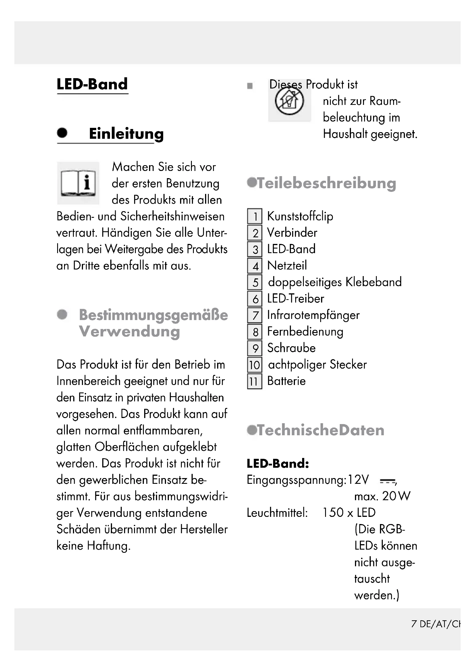 86 DE/AT/CH Einleitung Bestimmungsgemäße Verwendung ........................................ Seite 7 Teilebeschreibung ................................................................... Seite 7 Technische Daten .................................................................... Seite 7 Lieferumfang ............................................................................ Seite 8 Sicherheits hinweise .................................................... Seite 8 Sicherheitshinweise für Batterien ............................................ Seite 10 Montage ............................................................................... Seite 11 Inbetriebnahme LED-Band mittels Fernbedienung ein- / ausschalten .............. Seite 13 Leuchteffekte mittels Fernbedienung steuern ......................... Seite 14 Batterie wechseln .................................................................... Seite 14 Reinigung und Pflege ................................................ Seite 15 Entsorgung ......................................................................... Seite 15 Garantie ............................................................................... Seite 167 DE/AT/CH LED-Band Einleitung Machen Sie sich vor der ersten Benutzung des Produkts mit allen Bedien- und Sicherheitshinweisen vertraut. Händigen Sie alle Unter- lagen bei Weitergabe des Pro dukts an Dritte ebenfalls mit aus. Bestimmungsgemäße Verwendung Das Produkt ist für den Betrieb im Innenbereich geeignet und nur für den Einsatz in privaten Haushalten vorgesehen. Das Produkt kann auf allen normal entflammbaren, glatten Oberflächen aufgeklebt werden. Das Produkt ist nicht für den gewerblichen Einsatz be- stimmt. Für aus bestimmungswidri- ger Verwendung entstandene Schäden übernimmt der Hersteller keine Haftung. Dieses Produkt ist nicht zur Raum- beleuchtung im Haushalt geeignet. Teilebeschreibung