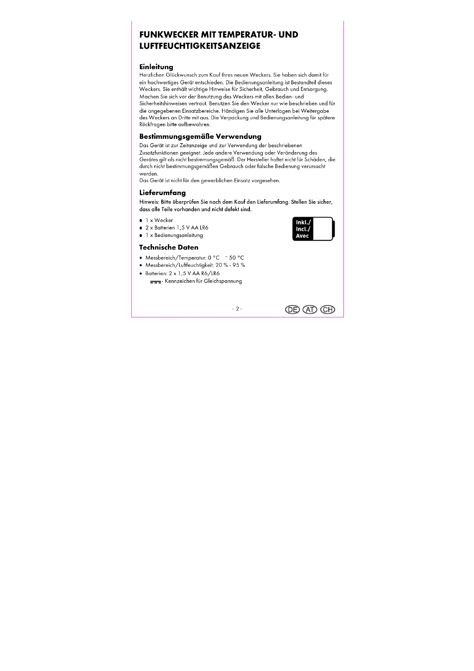 LUFTFEUCHTIGKEITSANZEIGE Einleitung Herzlichen Glückwunsch zum Kauf Ihres neuen Weckers. Sie haben sich damit für ein hochwertiges Gerät entschieden. Die Bedienungsanleitung ist Bestandteil dieses Weckers. Sie enthält wichtige Hinweise für Sicherheit, Gebrauch und Entsorgung. Machen Sie sich vor der Benutzung des Weckers mit allen Bedien- und Sicherheitshinweisen vertraut. Benutzen Sie den Wecker nur wie beschrieben und für die angegebenen Einsatzbereiche. Händigen Sie alle Unterlagen bei Weitergabe des Weckers an Dritte mit aus. Die Verpackung und Bedienungsanleitung für spätere Rückfragen bitte aufbewahren. Bestimmungsgemäße Verwendung Das Gerät ist zur Zeitanzeige und zur Verwendung der beschriebenen Zusatzfunktionen geeignet. Jede andere Verwendung oder Veränderung des Gerätes gilt als nicht bestimmungsgemäß. Der Hersteller haftet nicht für Schäden, die durch nicht bestimmungsgemäßen Gebrauch oder falsche Bedienung verursacht werden. Das Gerät ist nicht für den gewerblichen Einsatz vorgesehen. Lieferumfang Hinweis: Bitte überprüfen Sie nach dem Kauf den Lieferumfang. Stellen Sie sicher, dass alle Teile vorhanden und nicht defekt sind.