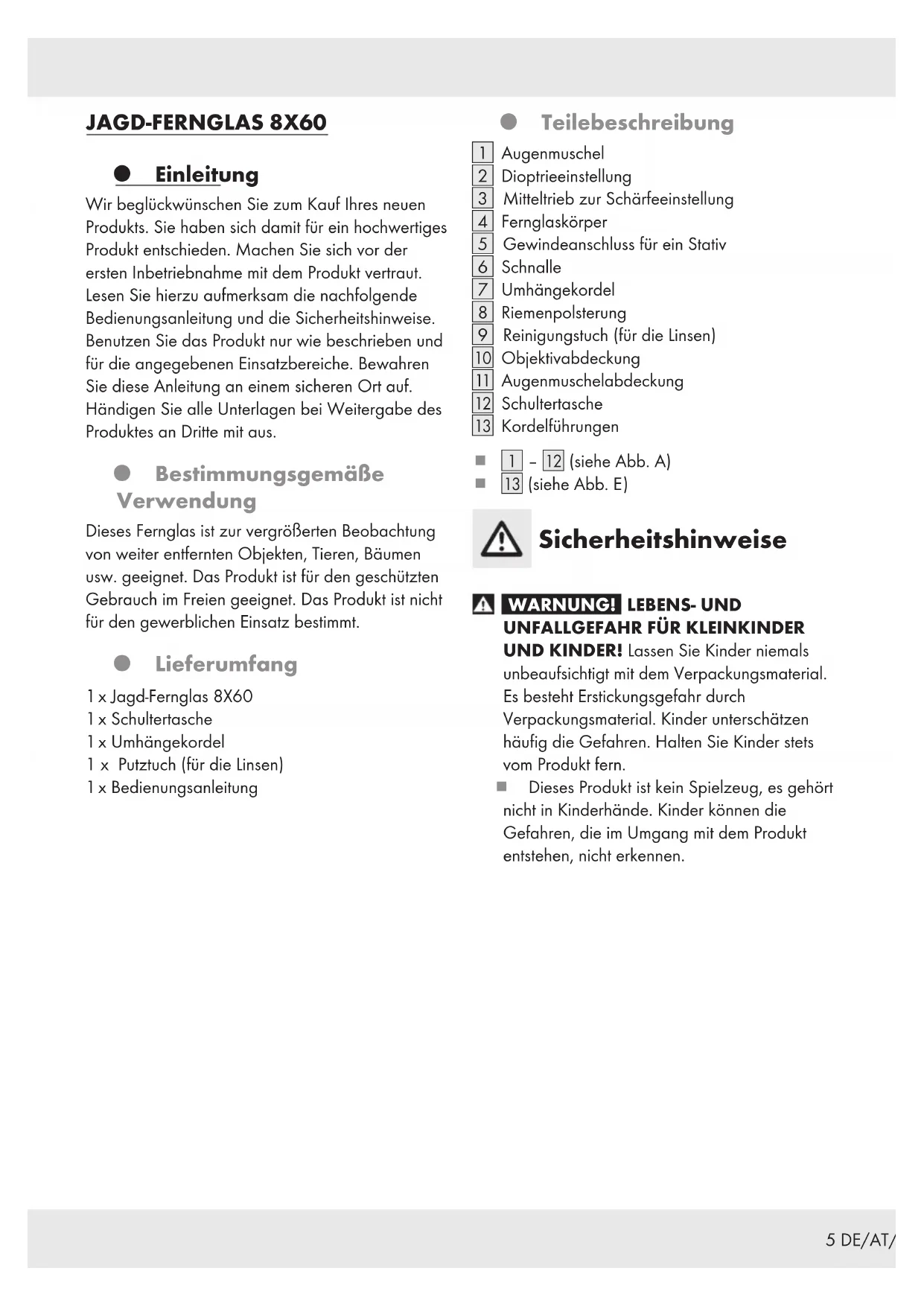 135 DE/AT/CH JAGD-FERNGLAS 8X60 Einleitung Wir beglückwünschen Sie zum Kauf Ihres neuen Produkts. Sie haben sich damit für ein hochwertiges Produkt entschieden. Machen Sie sich vor der ersten Inbetriebnahme mit dem Produkt vertraut. Lesen Sie hierzu aufmerksam die nachfolgende Bedienungsanleitung und die Sicherheitshinweise. Benutzen Sie das Produkt nur wie beschrieben und für die angegebenen Einsatzbereiche. Bewahren Sie diese Anleitung an einem sicheren Ort auf. Händigen Sie alle Unterlagen bei Weitergabe des Produktes an Dritte mit aus. Bestimmungsgemäße Verwendung Dieses Fernglas ist zur vergrößerten Beobachtung von weiter entfernten Objekten, Tieren, Bäumen usw. geeignet. Das Produkt ist für den geschützten Gebrauch im Freien geeignet. Das Produkt ist nicht für den gewerblichen Einsatz bestimmt. Lieferumfang 1 x Jagd-Fernglas 8X60 1 x Schultertasche 1 x Umhängekordel 1 x Putztuch (für die Linsen) 1 x Bedienungsanleitung Teilebeschreibung [1] Augenmuschel [2] Dioptrieeinstellung [3] Mitteltrieb zur Schärfeeinstellung [4] Fernglaskörper [5] Gewindeanschluss für ein Stativ [6] Schnalle [7] Umhängekordel [8] Riemenpolsterung [9] Reinigungstuch (für die Linsen) [] Objektivabdeckung [] Augenmuschelabdeckung [] Schultertasche [] Kordelführungen [1] ‒[] (siehe Abb. A) [] (siehe Abb. E) Sicherheitshinweise