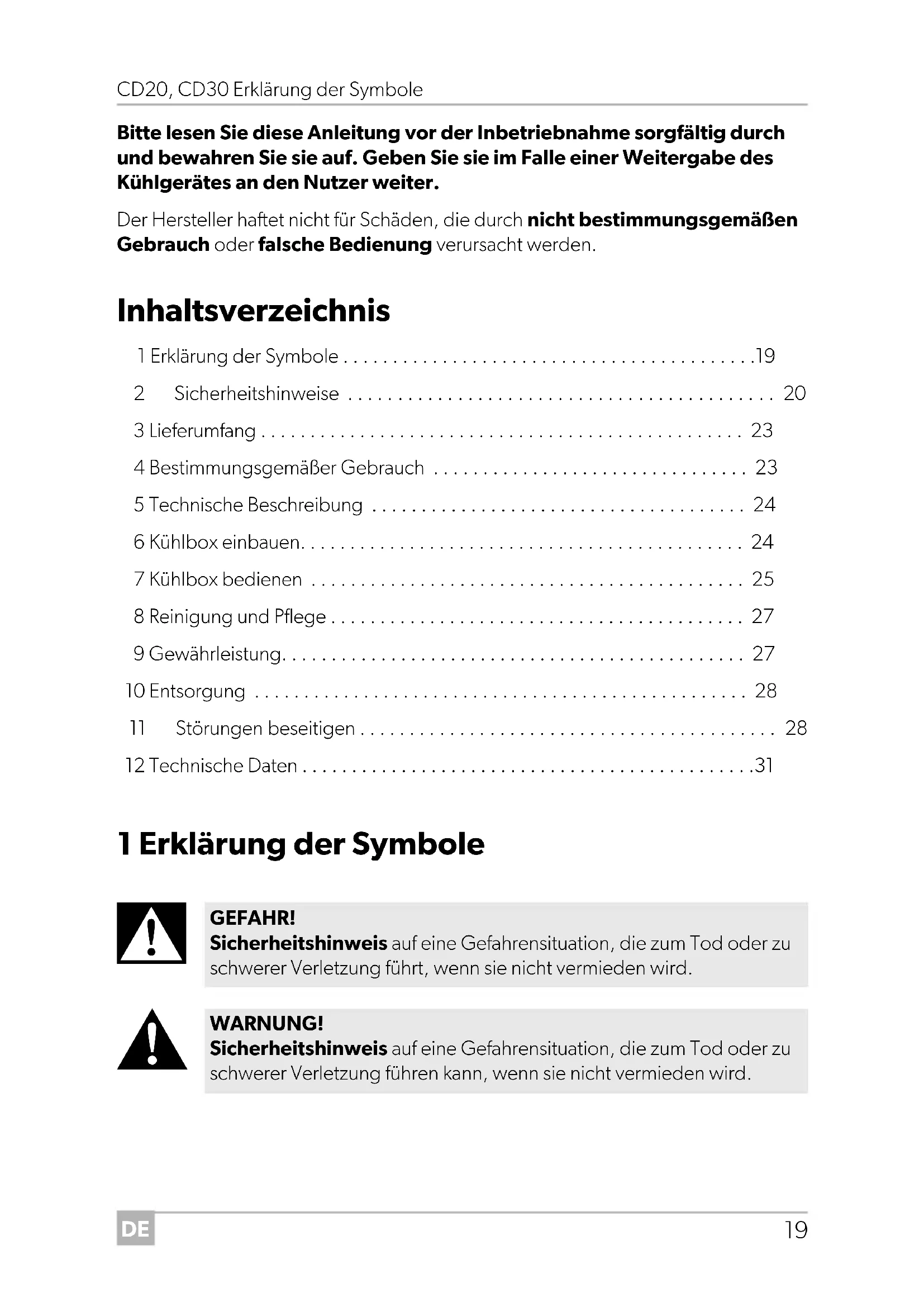 - Bitte lesen Sie diese Anleitung vor der Inbetriebnahme sorgfältig durch und bewahren Sie sie auf. Geben Sie sie im Falle einer Weitergabe des Kühlgerätes an den Nutzer weiter. Der Hersteller haftet nicht für Schäden, die durch nicht bestimmungsgemäßen Gebrauch oder falsche Bedienung verursacht werden. Inhaltsverzeichnis 1 Erklärung der Symbole p. 19