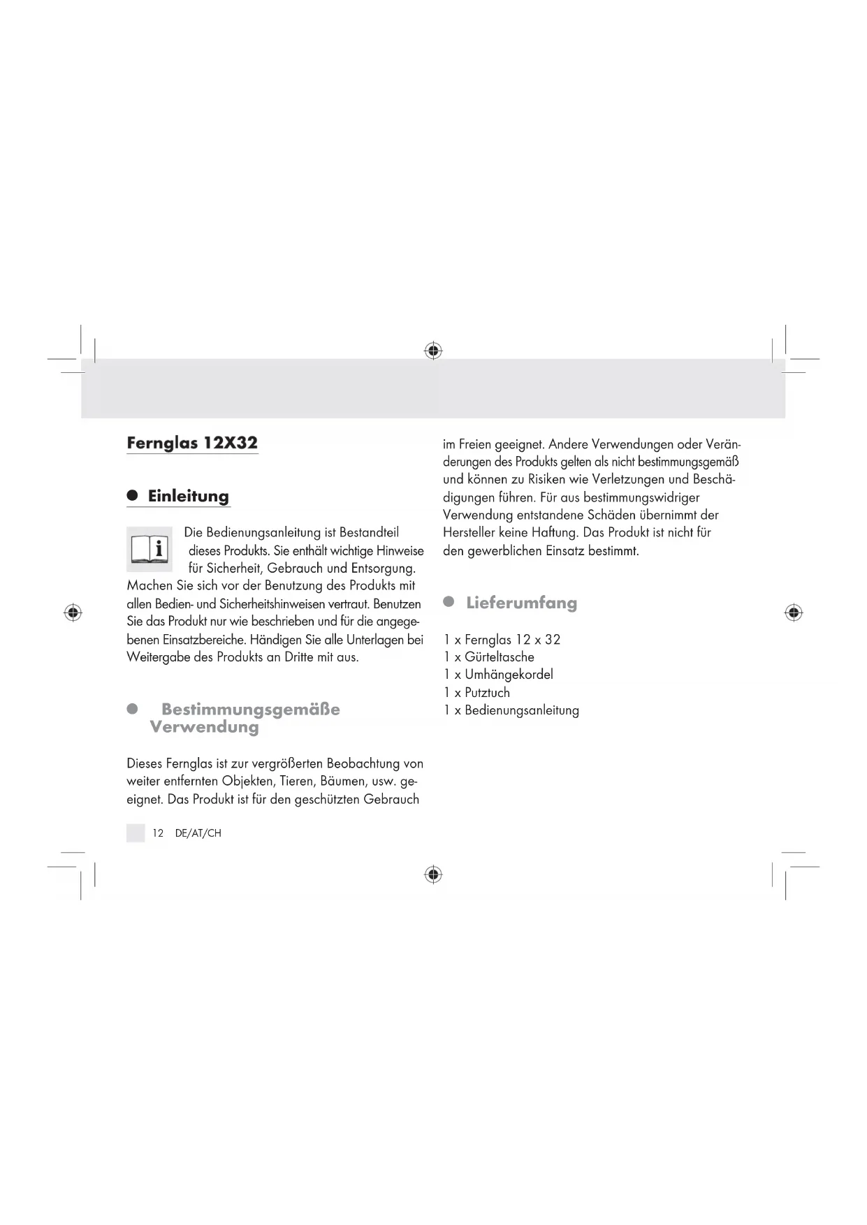 Lieferumfang 1 x Fernglas 12 x 32 1 x Gürteltasche 1 x Umhängekordel 1 x Putztuch 1 x Bedienungsanleitung13 DE/AT/CH