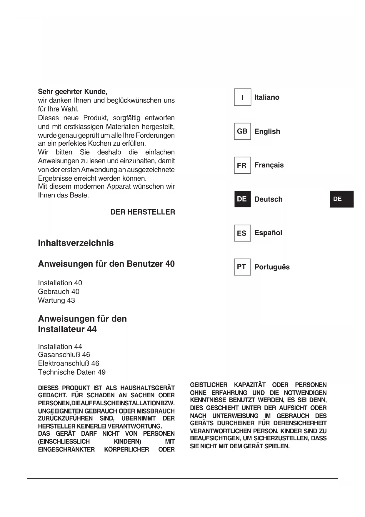 DIESES PRODUKT IST ALS HAUSHALTSGERAT GEDACHT. FÜR SCHADEN AN SACHEN ODER PERSONEN, DIEAUFFALSCHEINSTALLATIONBZW. UNGEEIGNETEN GEBRAUCH ODER MISSBRAUCH ZURUCKZUFHREN SIND, ÜBERNIMMT DER HERSTELLER KEINERLEI VERANTWORTUNG.