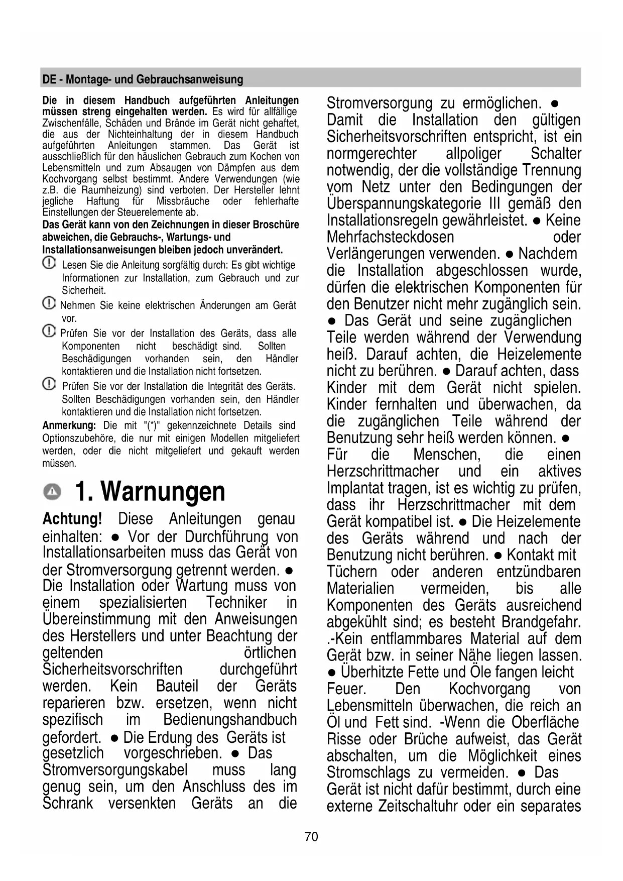 If the fault persists after the above checks, contact the nearest Customer Service.70 DE - Montage- und Gebrauchsanweisung Die in diesem Handbuch aufgeführten Anleitungen müssen streng eingehalten werden. Es wird für allfällige Zwischenfälle, Schäden und Brände im Gerät nicht gehaftet, die aus der Nichteinhaltung der in diesem Handbuch aufgeführten Anleitungen stammen. Das Gerät ist ausschließlich für den häuslichen Gebrauch zum Kochen von Lebensmitteln und zum Absaugen von Dämpfen aus dem Kochvorgang selbst bestimmt. Andere Verwendungen (wie z.B. die Raumheizung) sind verboten. Der Hersteller lehnt jegliche Haftung für Missbräuche oder fehlerhafte Einstellungen der Steuerelemente ab. Das Gerät kann von den Zeichnungen in dieser Broschüre abweichen, die Gebrauchs-, Wartungs- und Installationsanweisungen bleiben jedoch unverändert. Lesen Sie die Anleitung sorgfältig durch: Es gibt wichtige Informationen zur Installation, zum Gebrauch und zur Sicherheit. Nehmen Sie keine elektrischen Änderungen am Gerät vor. Prüfen Sie vor der Installation des Geräts, dass alle Komponenten nicht beschädigt sind. Sollten Beschädigungen vorhanden sein, den Händler kontaktieren und die Installation nicht fortsetzen. Prüfen Sie vor der Installation die Integrität des Geräts. Sollten Beschädigungen vorhanden sein, den Händler kontaktieren und die Installation nicht fortsetzen. Anmerkung: Die mit "(*)" gekennzeichnete Details sind Optionszubehöre, die nur mit einigen Modellen mitgeliefert werden, oder die nicht mitgeliefert und gekauft werden müssen.
