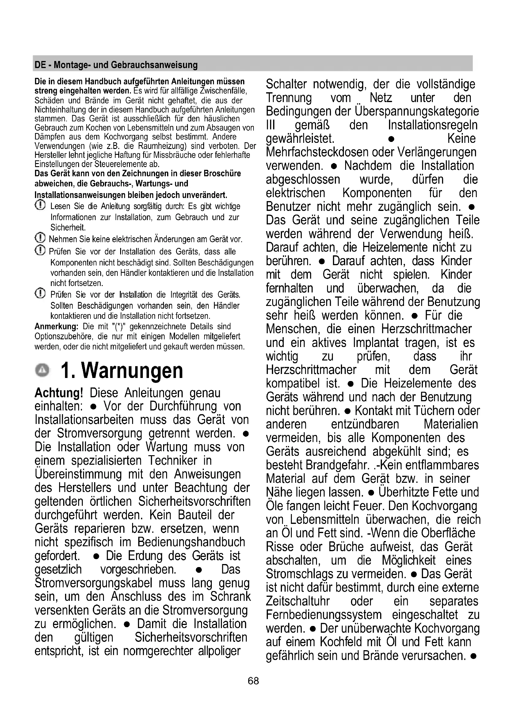 If the fault persists after the above checks, contact the nearest Customer Service.68 DE - Montage- und Gebrauchsanweisung Die in diesem Handbuch aufgeführten Anleitungen müssen streng eingehalten werden. Es wird für allfällige Zwischenfälle, Schäden und Brände im Gerät nicht gehaftet, die aus der Nichteinhaltung der in diesem Handbuch aufgeführten Anleitungen stammen. Das Gerät ist ausschließlich für den häuslichen Gebrauch zum Kochen von Lebensmitteln und zum Absaugen von Dämpfen aus dem Kochvorgang selbst bestimmt. Andere Verwendungen (wie z.B. die Raumheizung) sind verboten. Der Hersteller lehnt jegliche Haftung für Missbräuche oder fehlerhafte Einstellungen der Steuerelemente ab. Das Gerät kann von den Zeichnungen in dieser Broschüre abweichen, die Gebrauchs-, Wartungs- und Installationsanweisungen bleiben jedoch unverändert. Lesen Sie die Anleitung sorgfältig durch: Es gibt wichtige Informationen zur Installation, zum Gebrauch und zur Sicherheit. Nehmen Sie keine elektrischen Änderungen am Gerät vor. Prüfen Sie vor der Installation des Geräts, dass alle Komponenten nicht beschädigt sind. Sollten Beschädigungen vorhanden sein, den Händler kontaktieren und die Installation nicht fortsetzen. Prüfen Sie vor der Installation die Integrität des Geräts. Sollten Beschädigungen vorhanden sein, den Händler kontaktieren und die Installation nicht fortsetzen. Anmerkung: Die mit "(*)" gekennzeichnete Details sind Optionszubehöre, die nur mit einigen Modellen mitgeliefert werden, oder die nicht mitgeliefert und gekauft werden müssen.