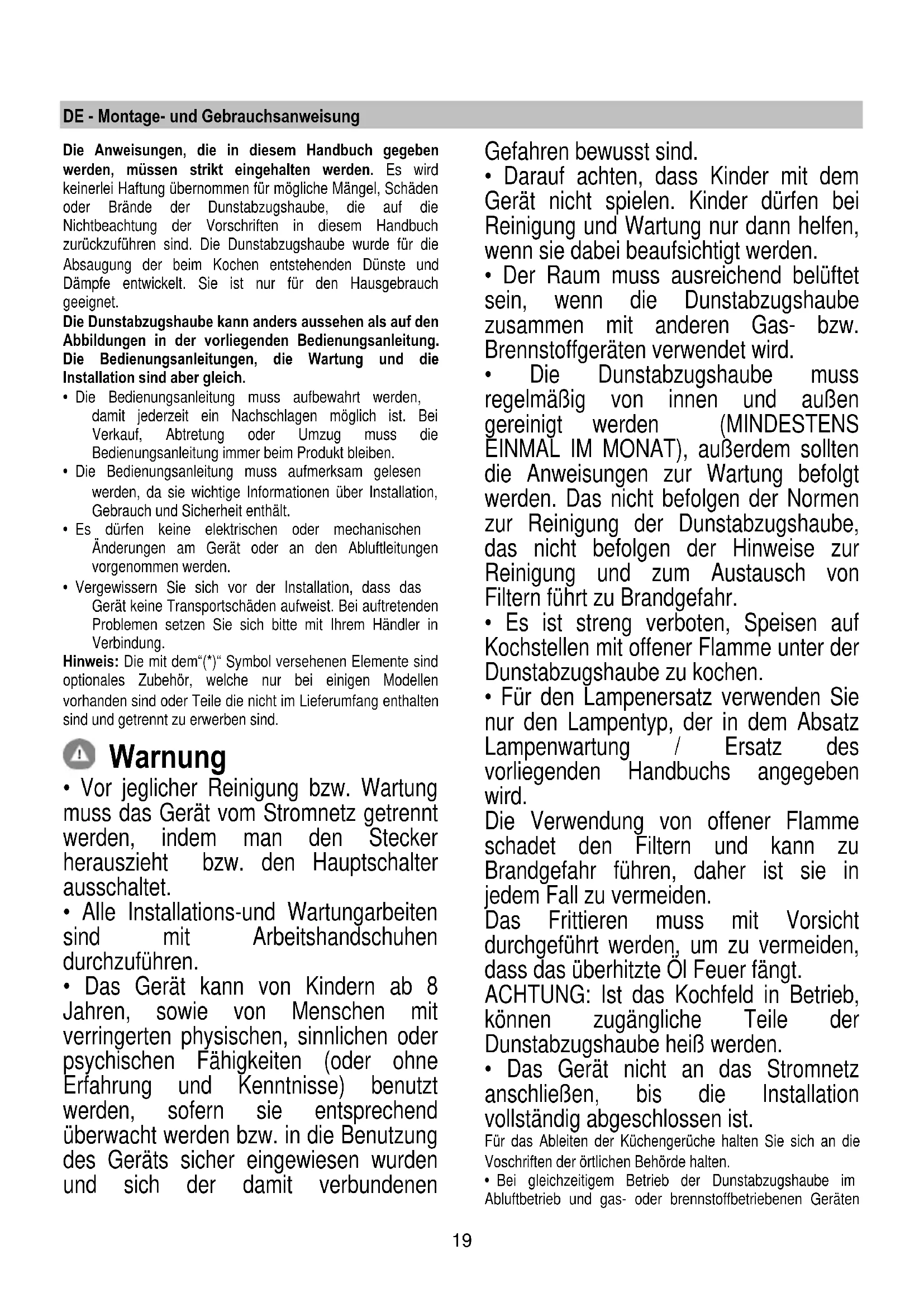 - Es ist streng verboten, Speisen auf Kochstellen mit offener Flamme unter der Dunstabzugshaube zu kochen.