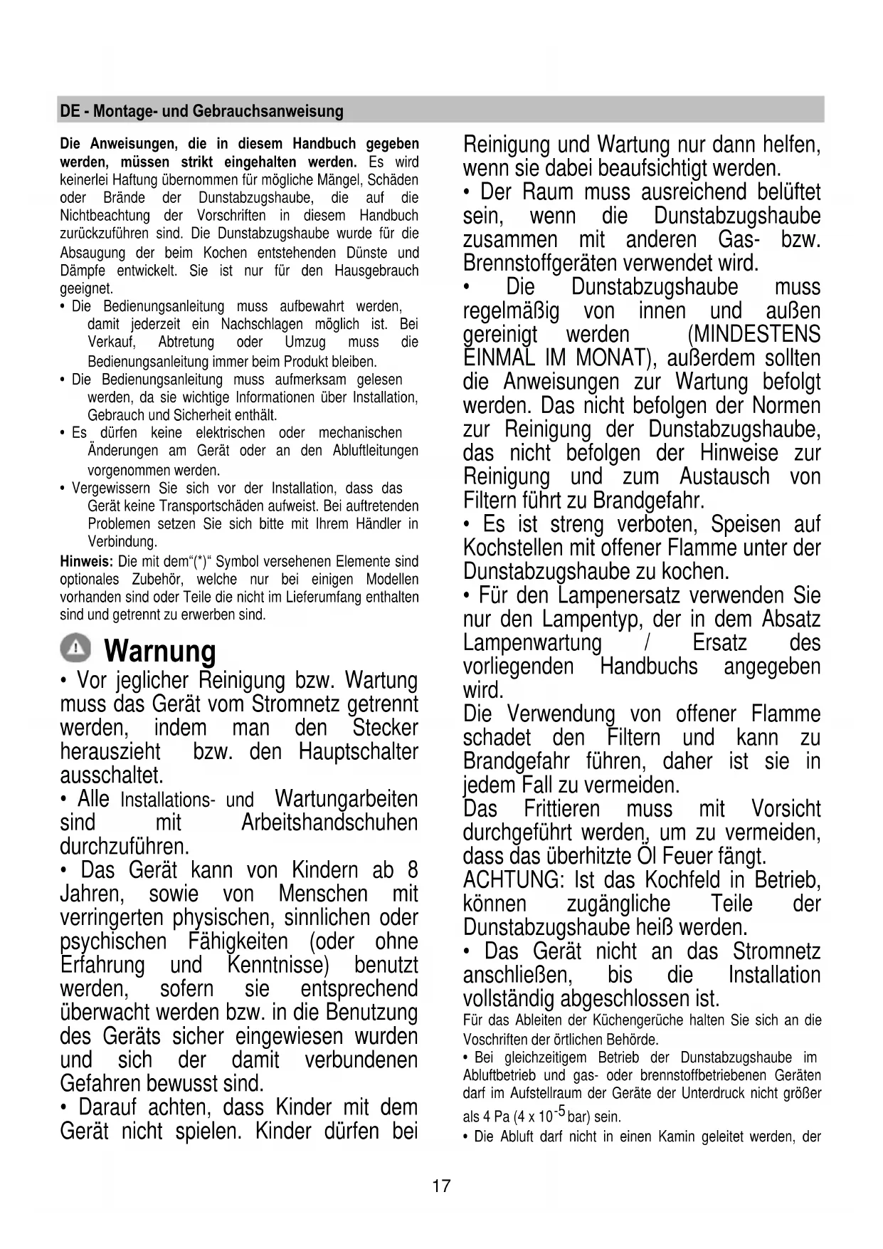 - Es dürfen keine elektrischen oder mechanischen Änderungen am Gerät oder an den Abluftleitungen vorgenommen werden.
