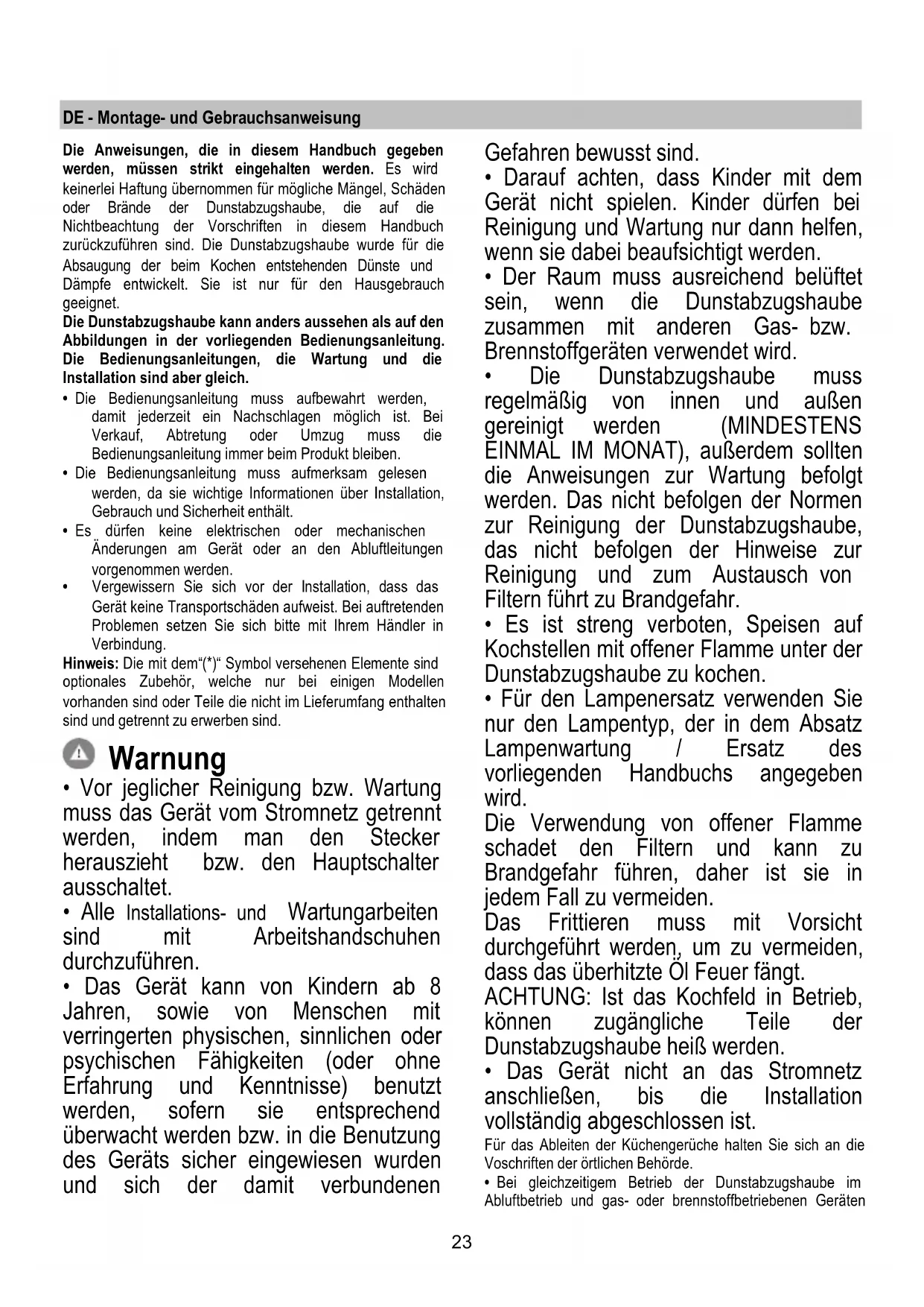 - Der Raum muss ausreichend belüftet sein, wenn die Dunstabzugshaube zusammen mit anderen Gas- bzw. Brennstoffgeräten verwendet wird.