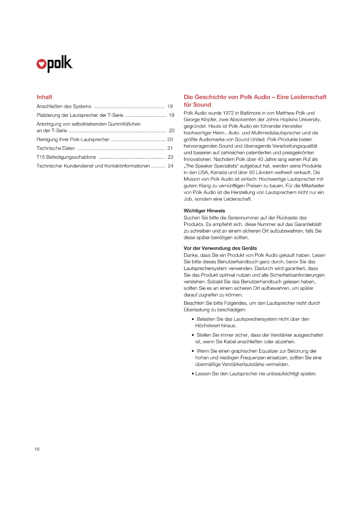 - Lassen Sie den Lautsprecher nie unbeaufsichtigt spielen. Inhalt Anschließen des Systems ................................................... 19 Platzierung der Lautsprecher der T-Serie .............................. 19 Anbringung von selbstklebenden Gummifüßchen an der T-Serie ....................................................................... 20 Reinigung Ihrer Polk-Lautsprecher ........................................ 20 Technische Daten ................................................................. 21 T15 Befestigungsschablone ................................................ 23 Technischer Kundendienst und Kontaktinformationen .......... 24T Series